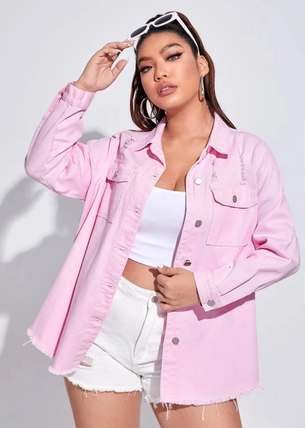 Here's a stylish pink denim jacket! It has a classic button-down style with front pockets. Perfect for adding a pop of colour to your wardrobe