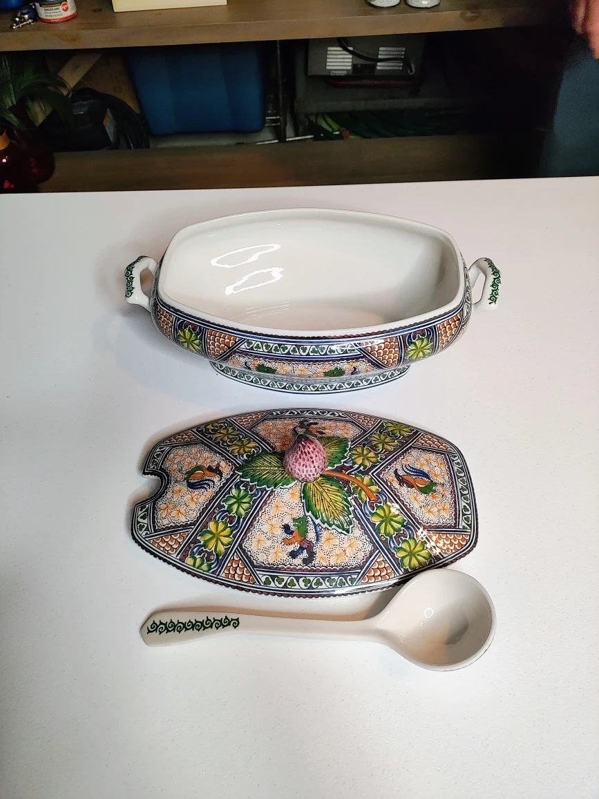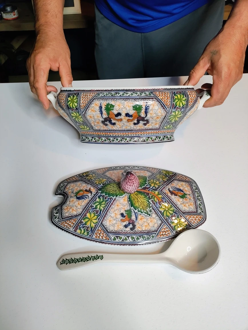 Vintage Hand-Painted Portuguese Lidded Tureen & Spoon