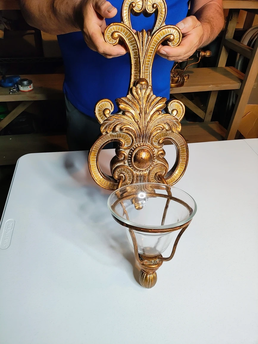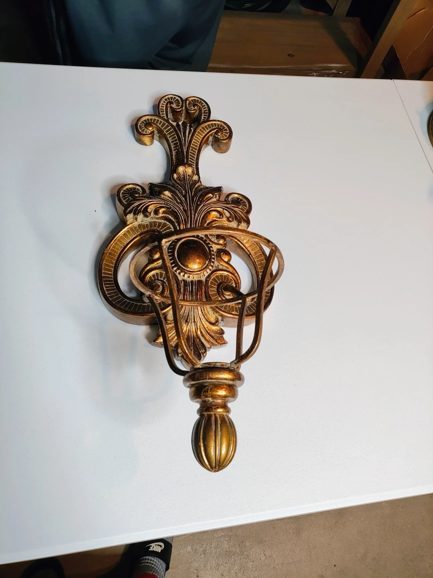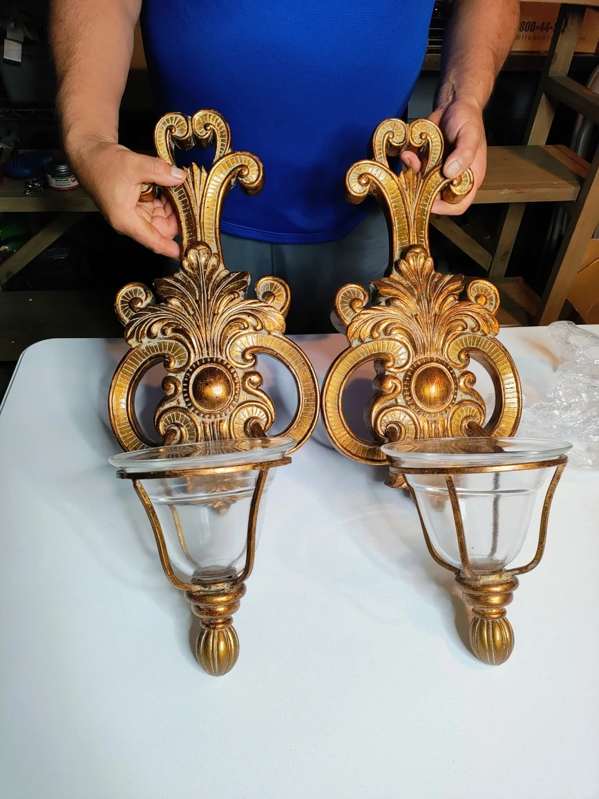 Selling a pair of ornate gold wall sconce candle holders! They have a unique and elegant design that would add a touch of sophistication to any room. The sconces feature a gold finish with intricate detailing and a glass candle holder. Would look great in a dining room or living room!
