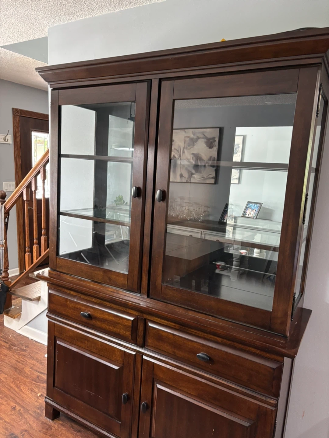 Selling a beautiful brown wood china cabinet. It features glass doors on the top half and solid wood doors and drawers on the bottom. Perfect for displaying your favorite items and storing dining essentials