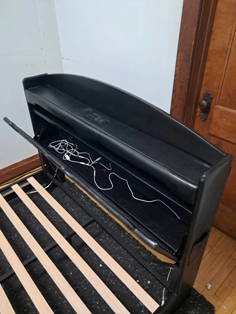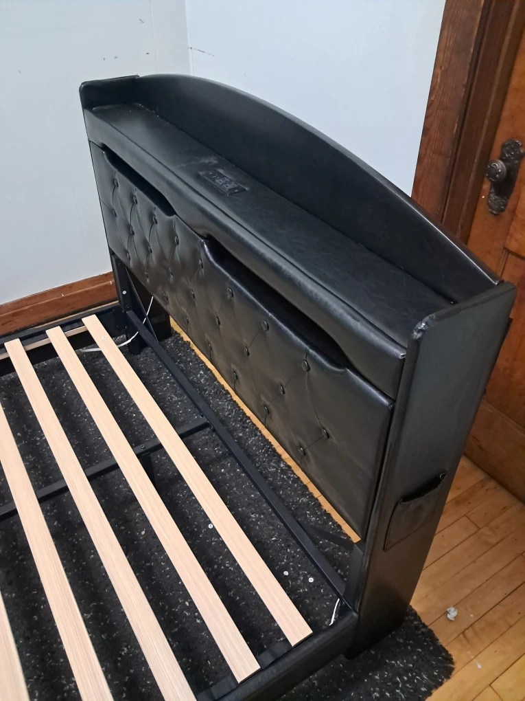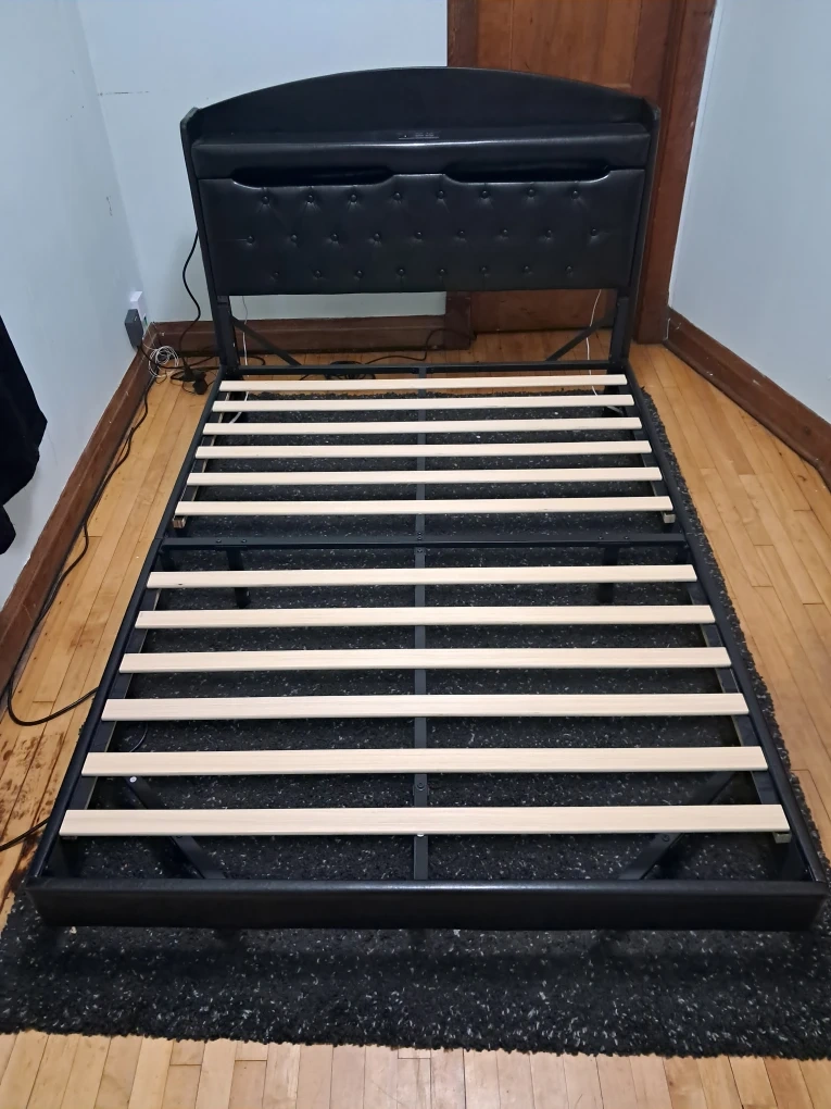Selling a black Queen platform bed frame. It features a tufted headboard and a storage compartment in the headboard. The bed frame has wooden slats for support. The bed also has LED lights that can be customized.
