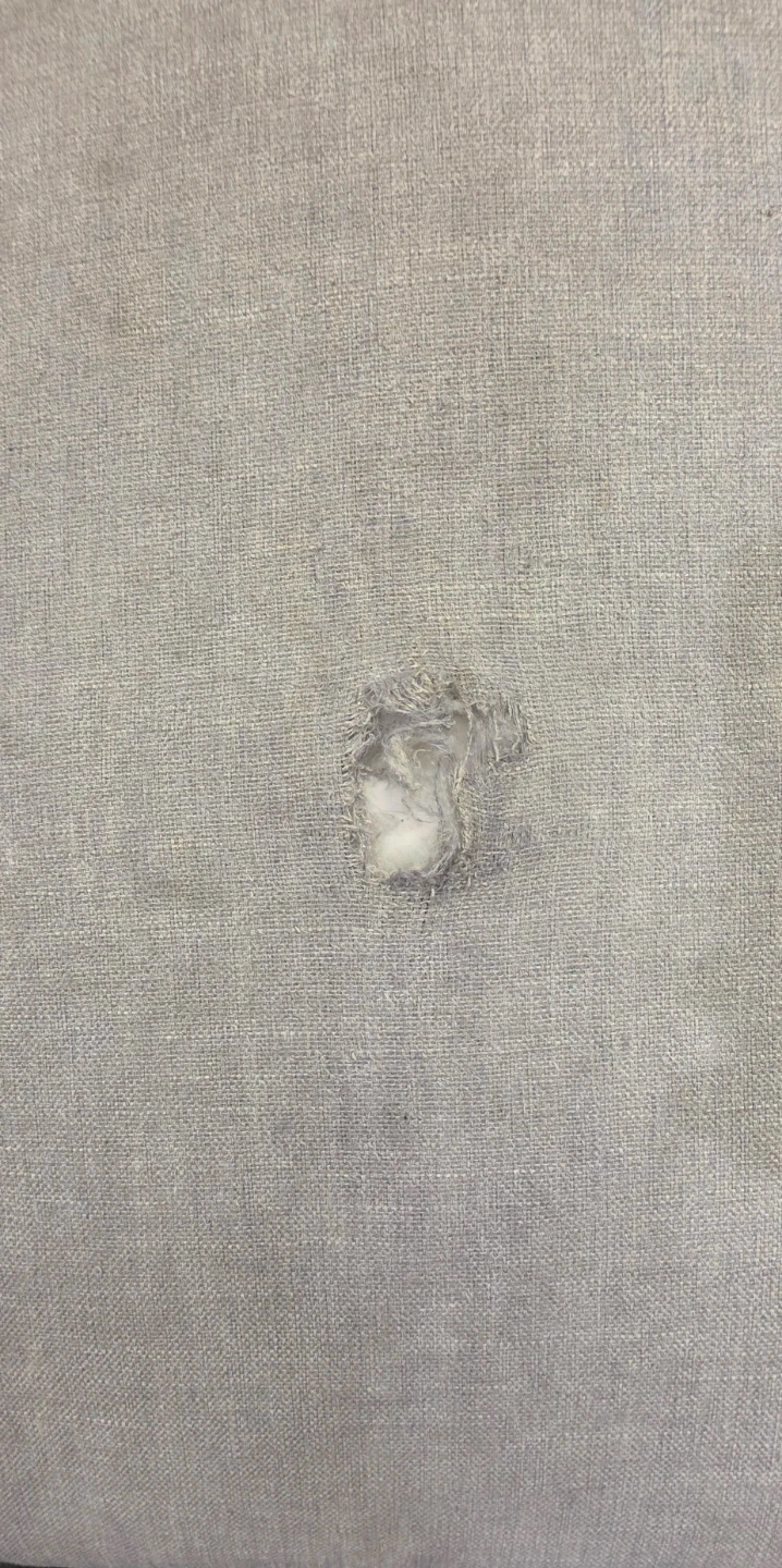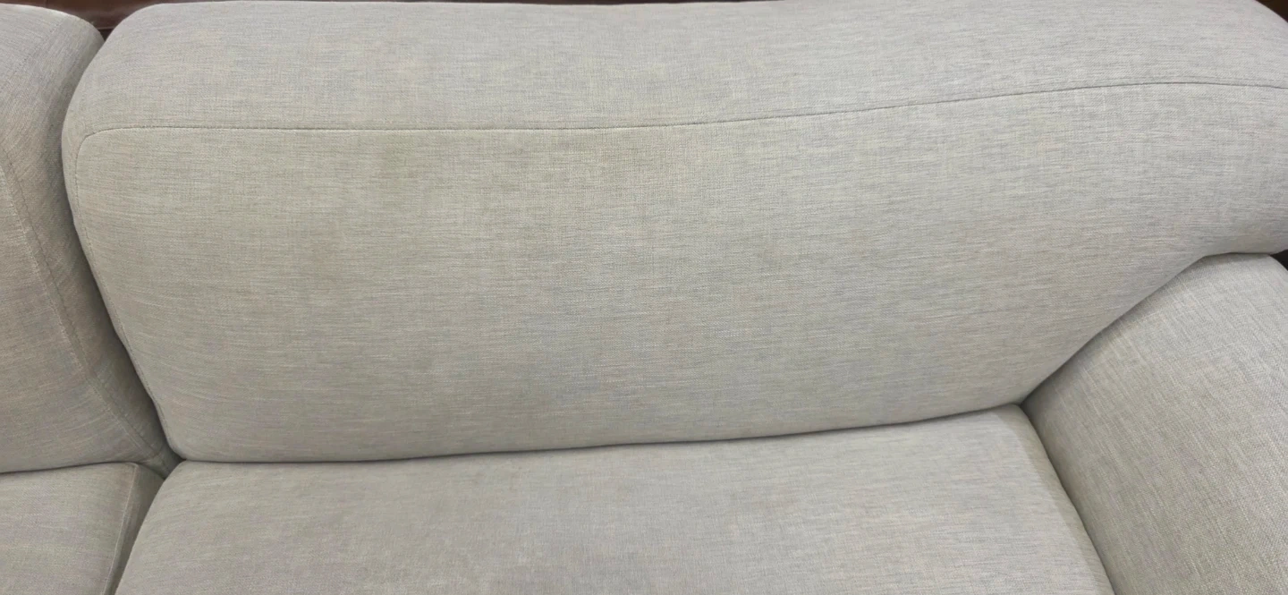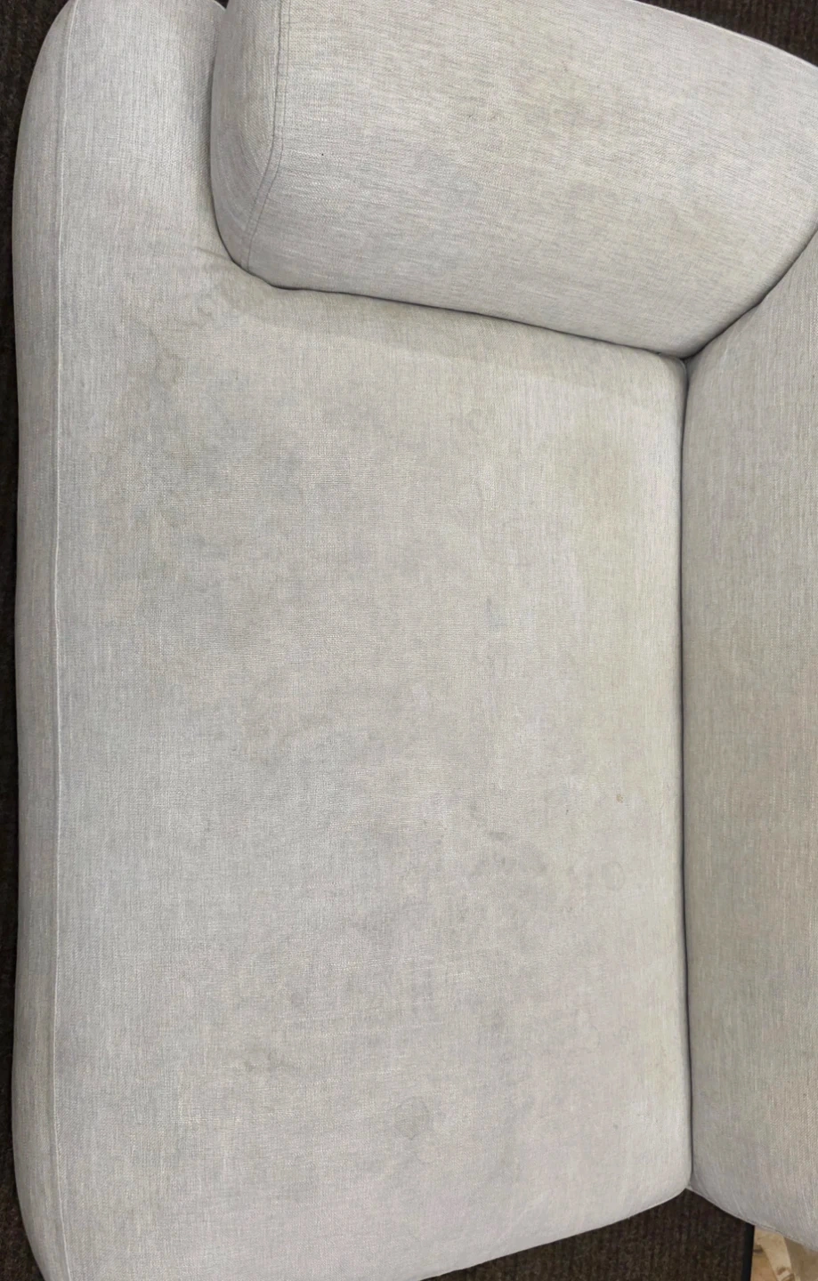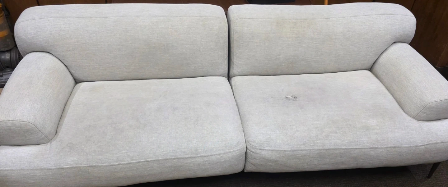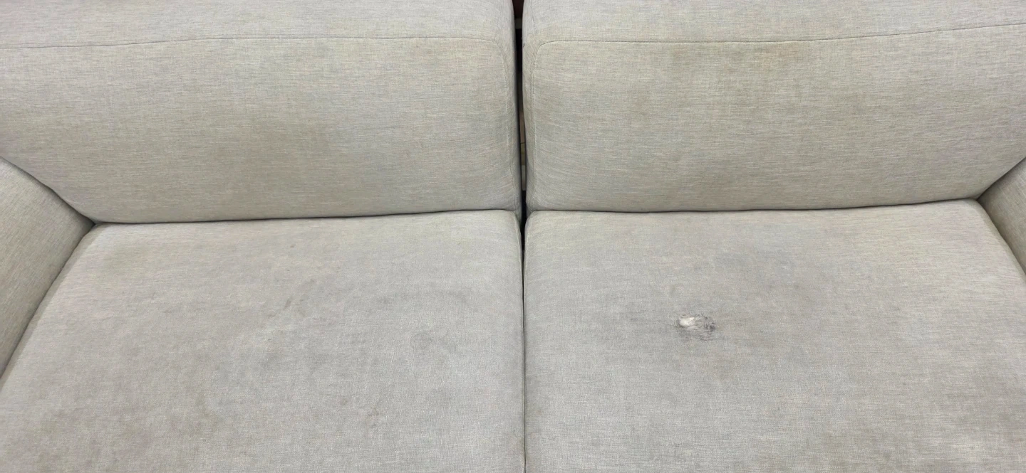 This is a light gray fabric loveseat. It's upholstered in a neutral tone fabric. The frame has metal legs and connectors. Shows some staining on the seat cushions. Small tears in one cushion.