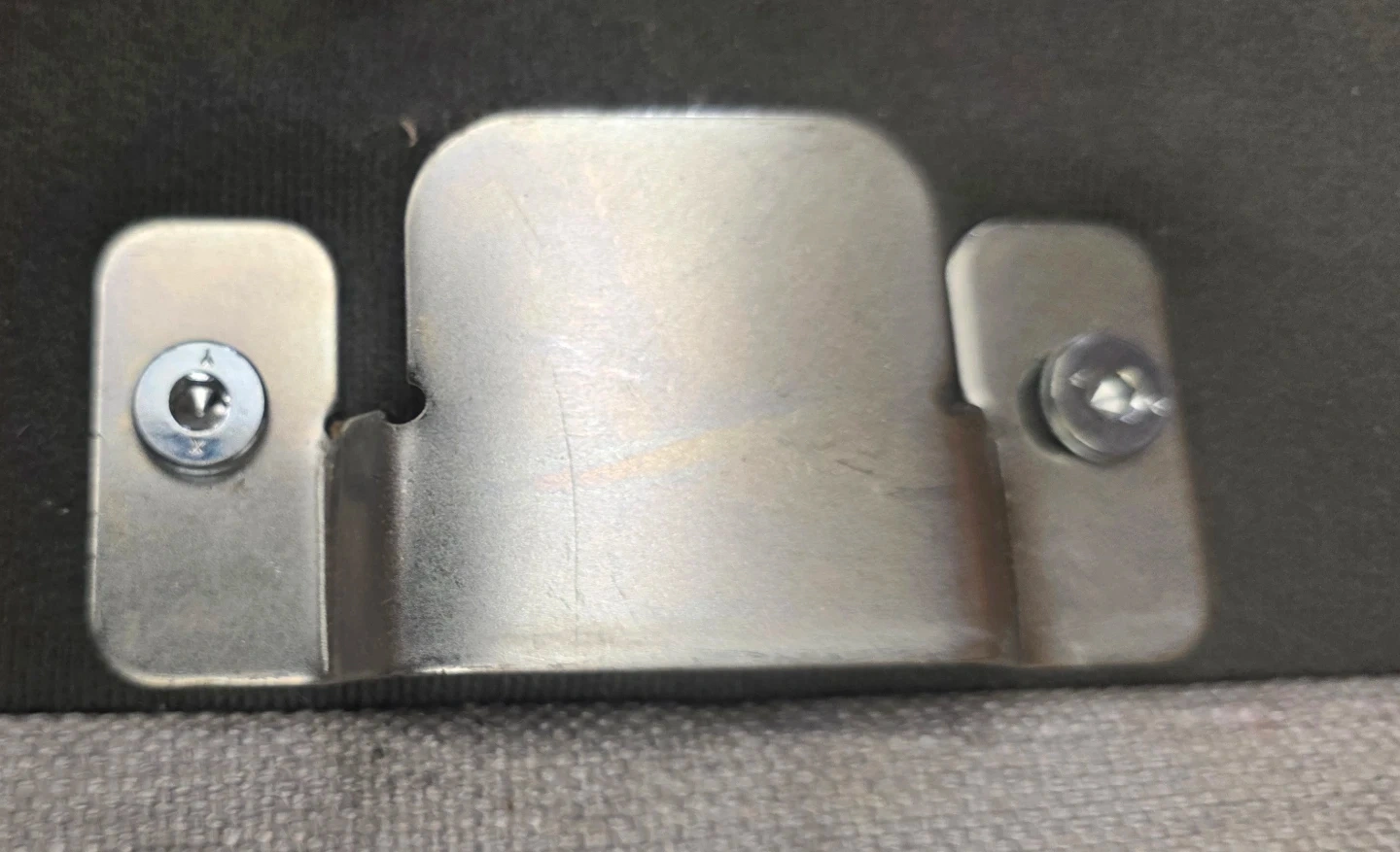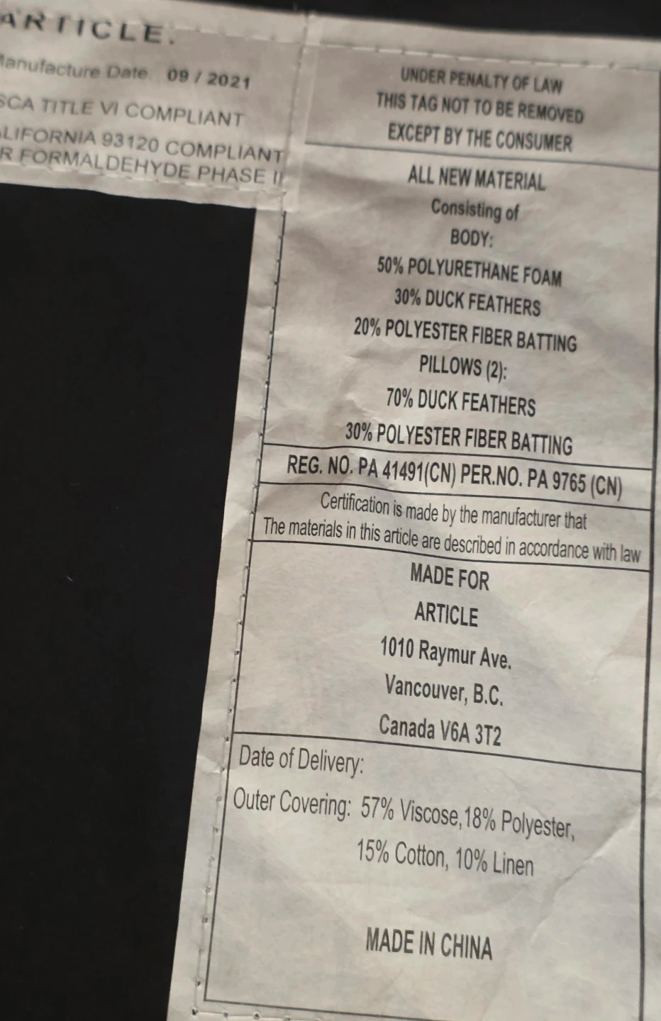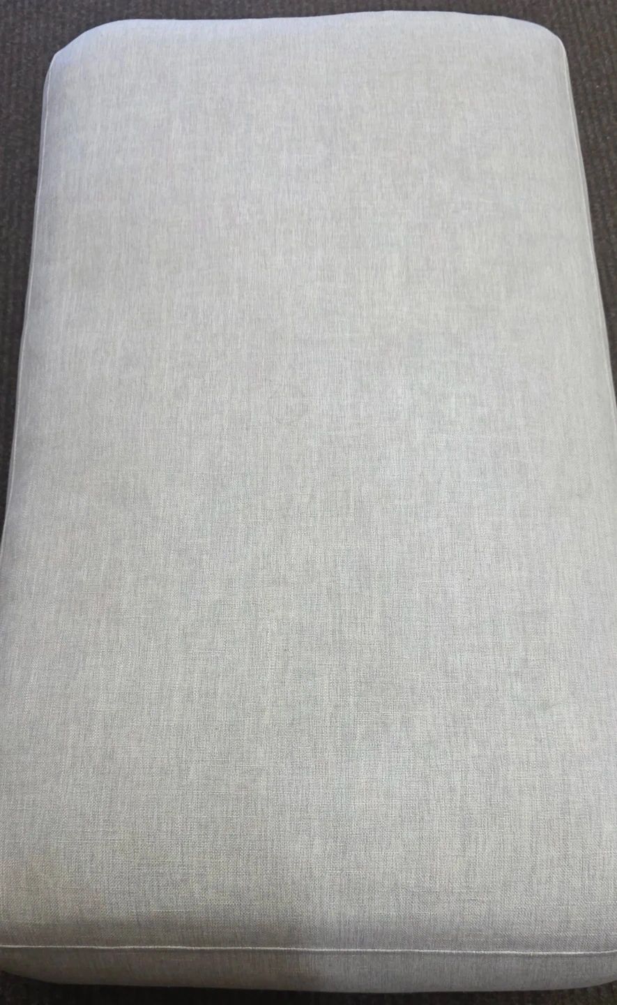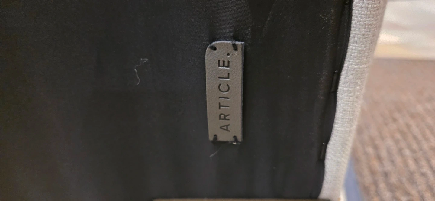 This is a light gray fabric loveseat. It's upholstered in a neutral tone fabric. The frame has metal legs and connectors. Shows some staining on the seat cushions. Small tears in one cushion.