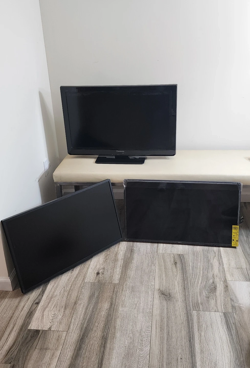 3 flat screen TVs. Includes one Panasonic TV and two TCL TVs. All black, flat screen models. FREE
