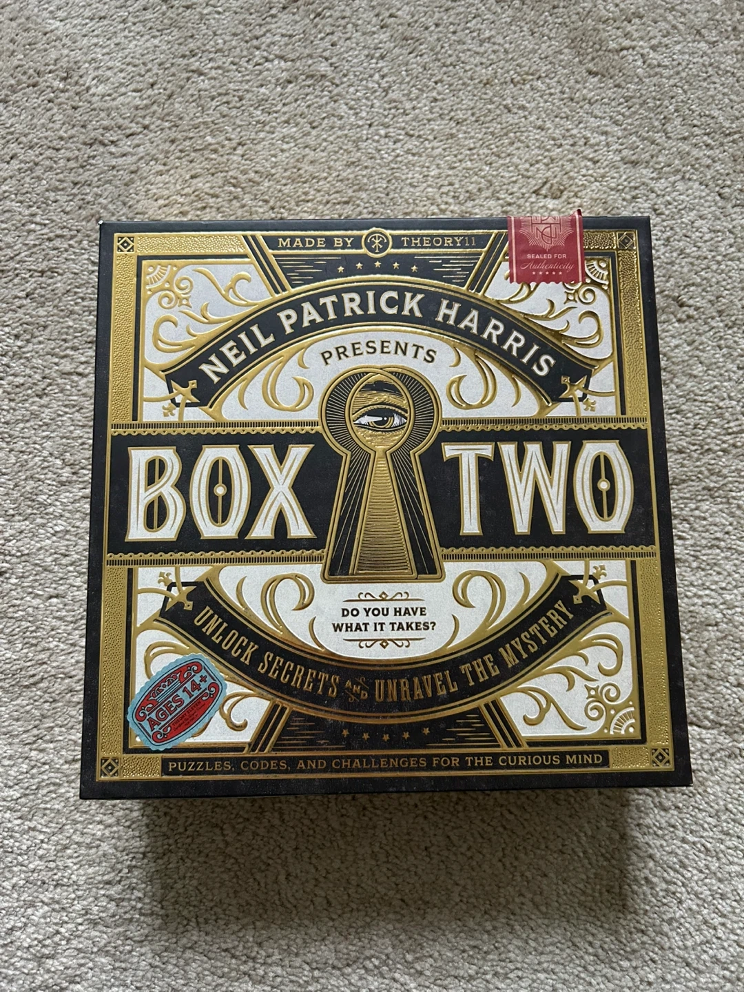 Selling a PUZZLE - BOX TWO by Theory11 & Neil Patrick Harris. It's a box of puzzles, codes, and challenges for the curious mind. Unlock secrets and unravel the mystery!