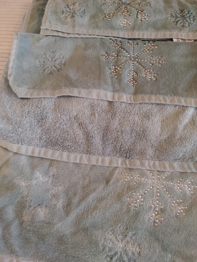 Selling a set of light blue towels with cute snowflake designs. These towels are in great condition and would add a touch of winter charm to any bathroom!