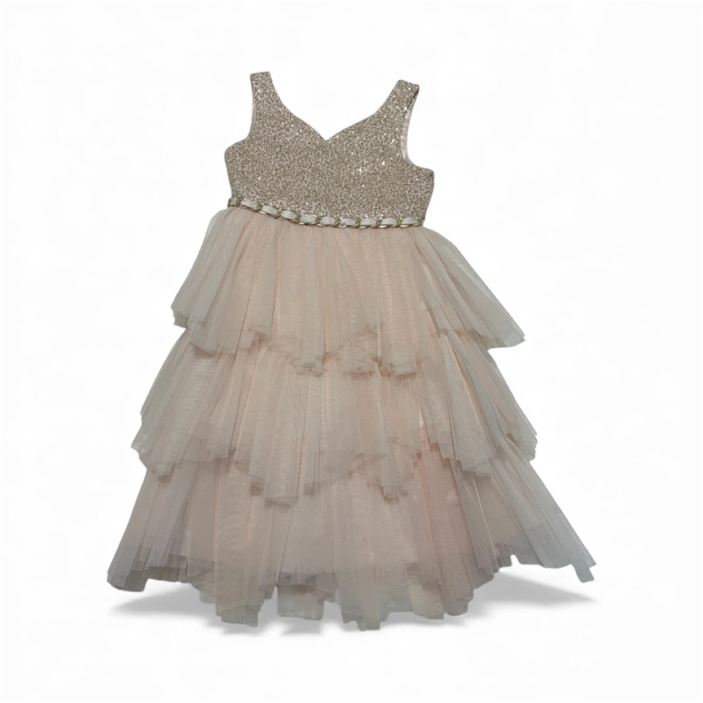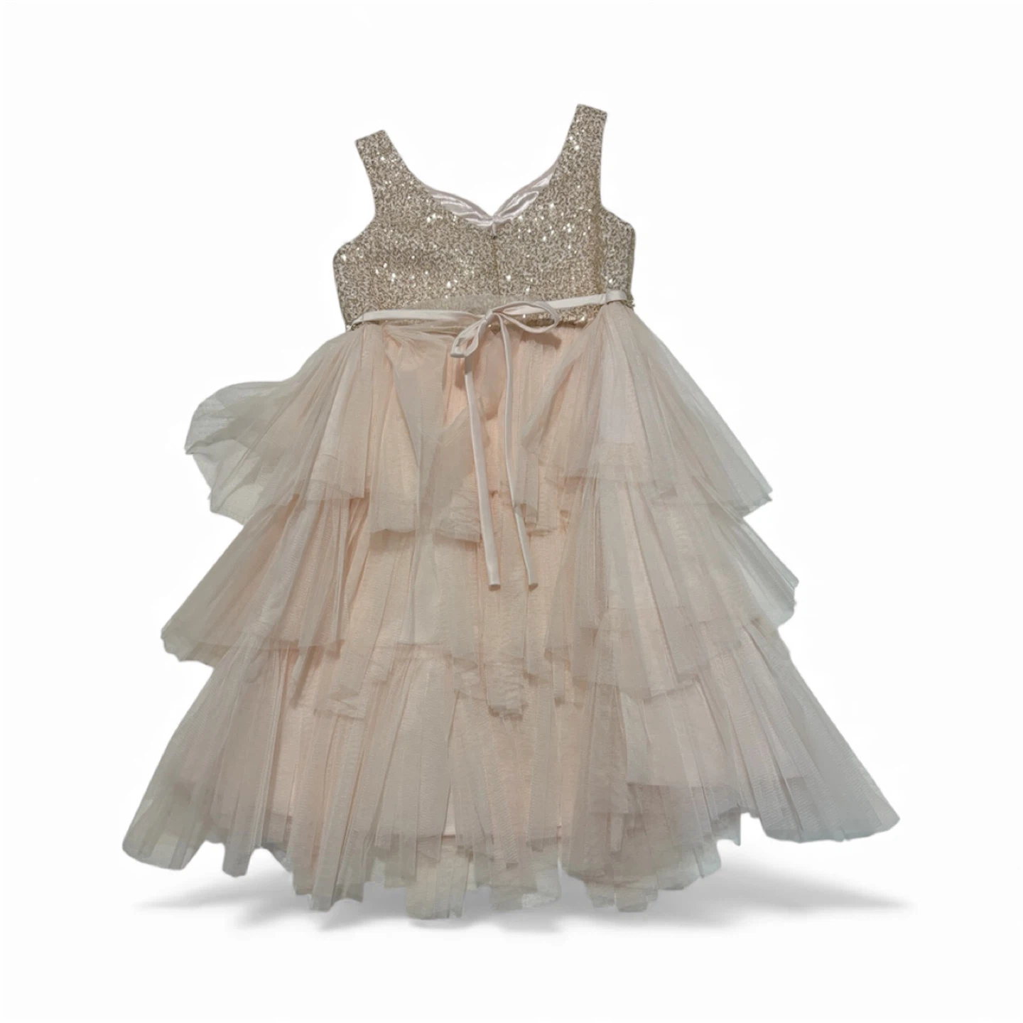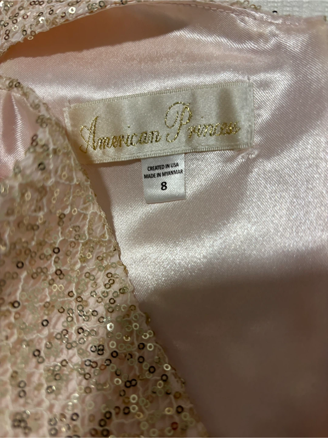 Selling an American Princess dress in size 8! The top is adorned with sequins, and the skirt is a beautiful tiered tulle. This dress would be perfect for a special occasion.
