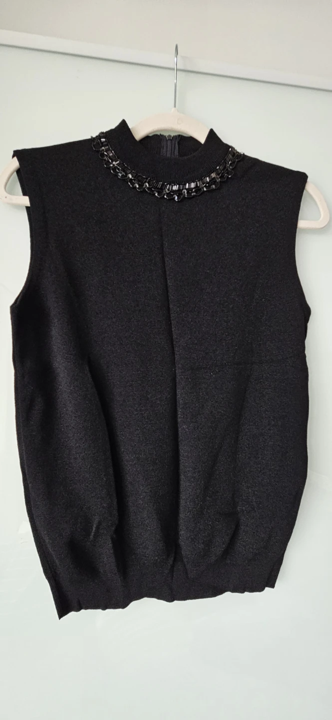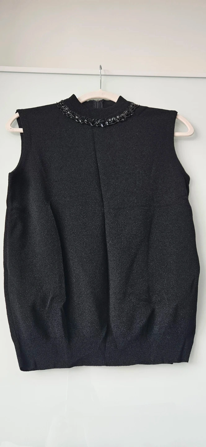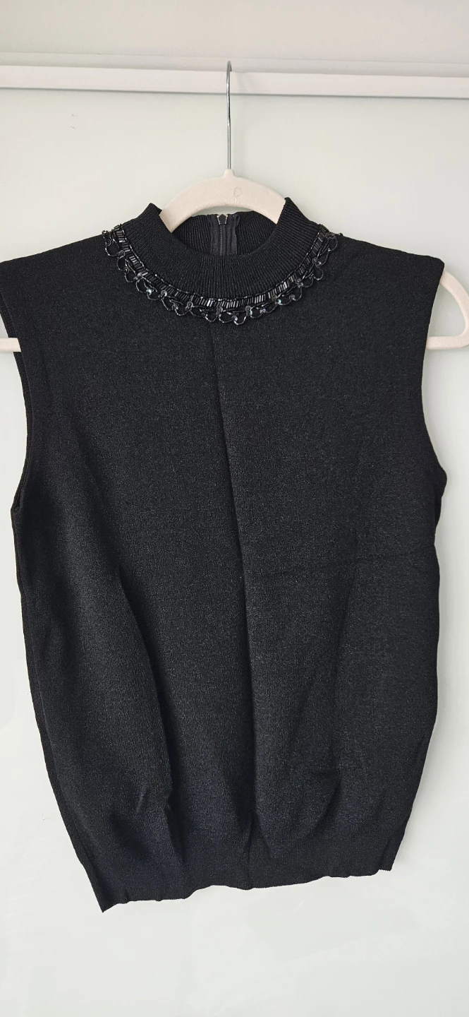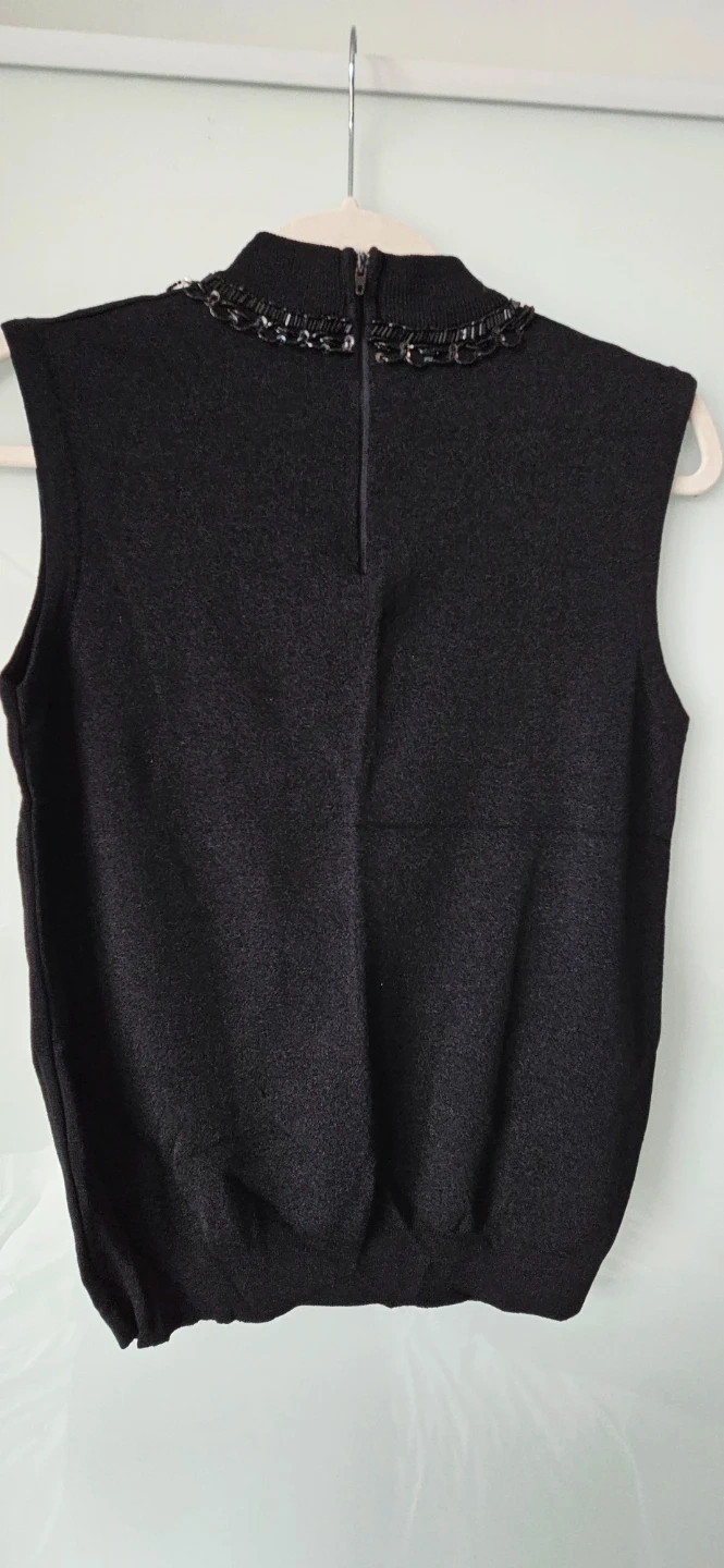 Selling a vintage sleeveless sweater top by Helen Harper! Size medium. It's a stylish piece with beaded detailing around the collar. Perfect for layering or wearing on its own. Made in Canada!