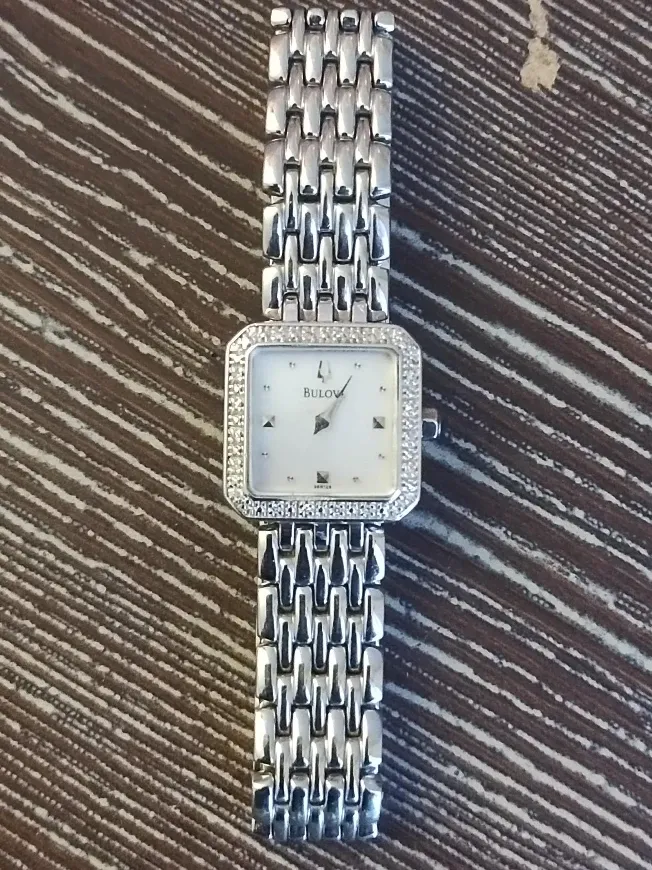 Selling a beautiful Bulova women's watch. It features a silver-tone band and a square face surrounded by diamonds. The watch is in good condition and ready to wear!