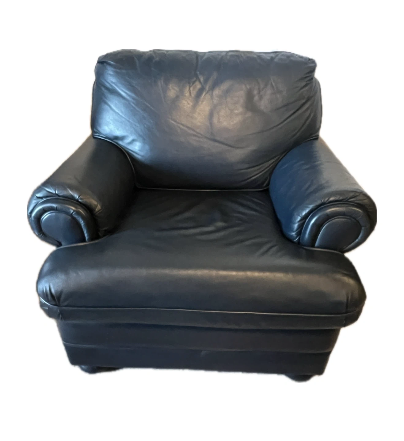 Beautiful genuine-leather armchair in a deep navy tone. This piece was lovingly cared for, regularly conditioned, and it truly shows. The leather is soft, thick, and in excellent condition with only natural creasing. No tears, no sagging, and no damage.