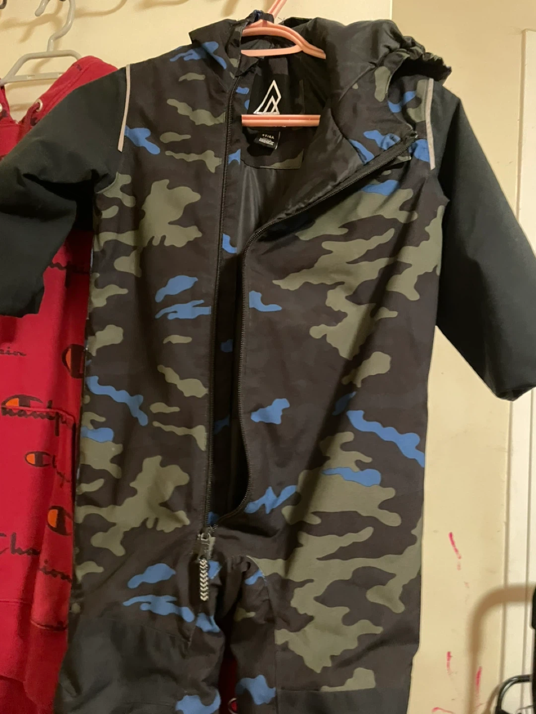 Selling a Ripzone snowsuit in size 4T/4A! It features a cool camo pattern with blue, green, and grey. Perfect for keeping your little one warm and dry this winter season