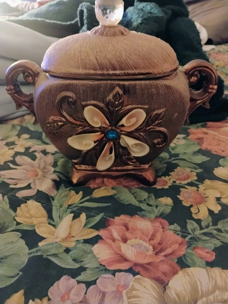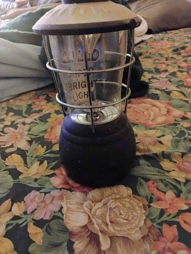 Selling a decorative jar with a lid, featuring a floral design and a blue gem accent. Also included is a vintage-style LED lantern, perfect for adding a cozy glow to any room