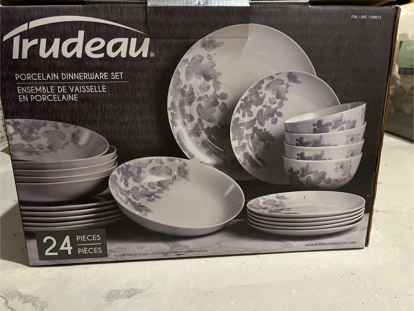 Selling a Trudeau porcelain dinnerware set, which includes 24 pieces! It's a beautiful set with a lovely floral design. Perfect for everyday use or special occasions
