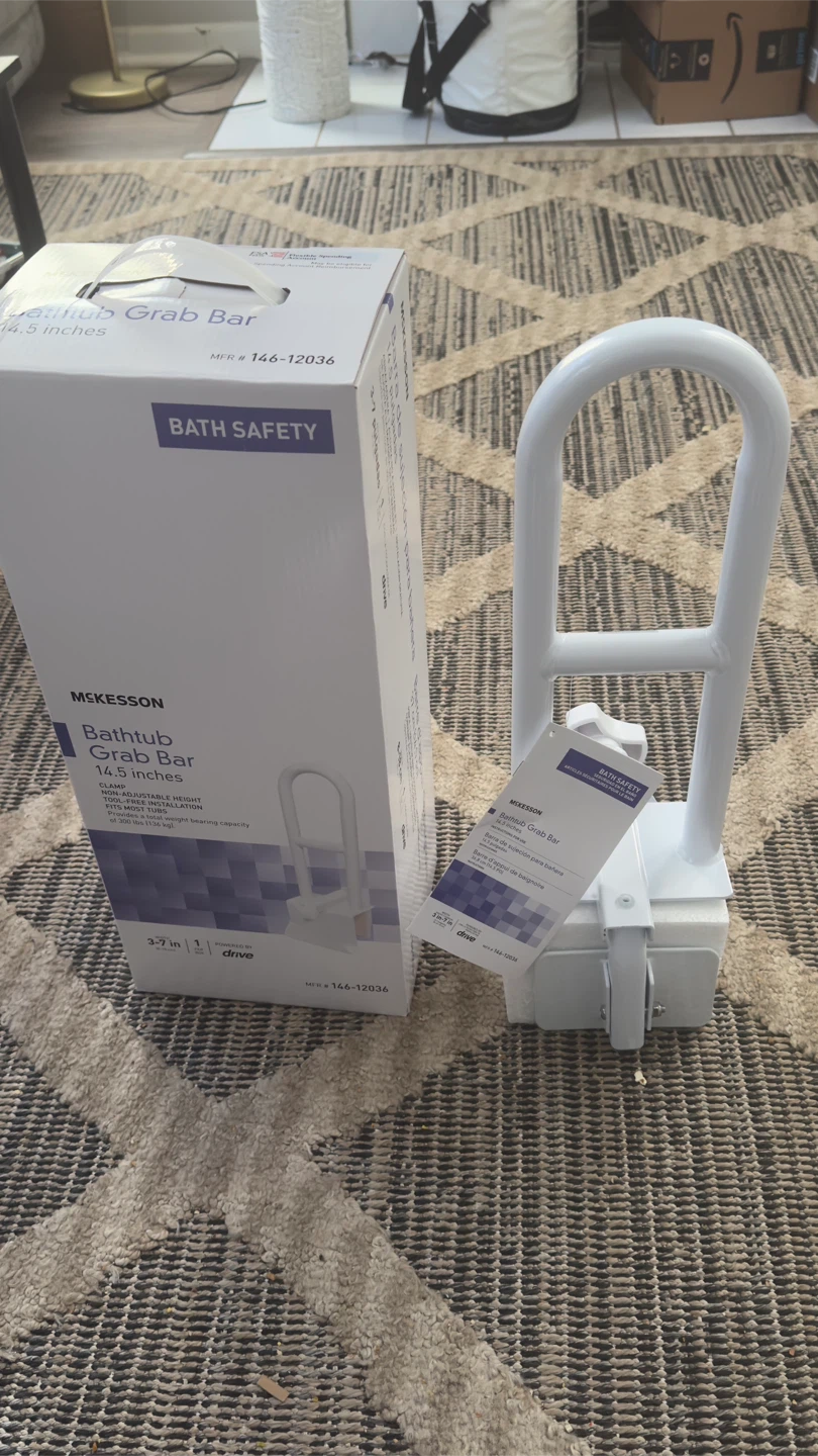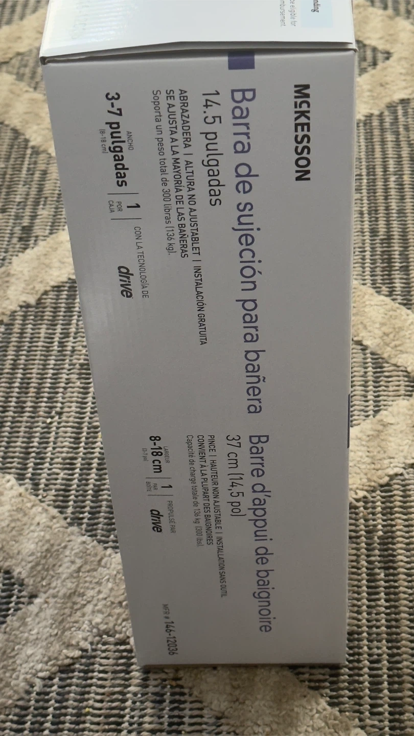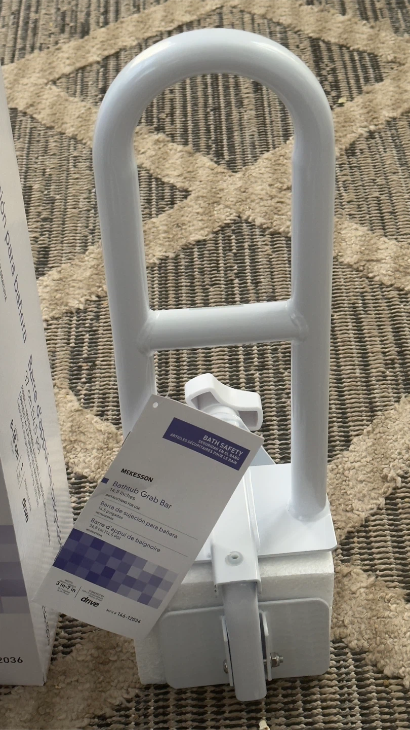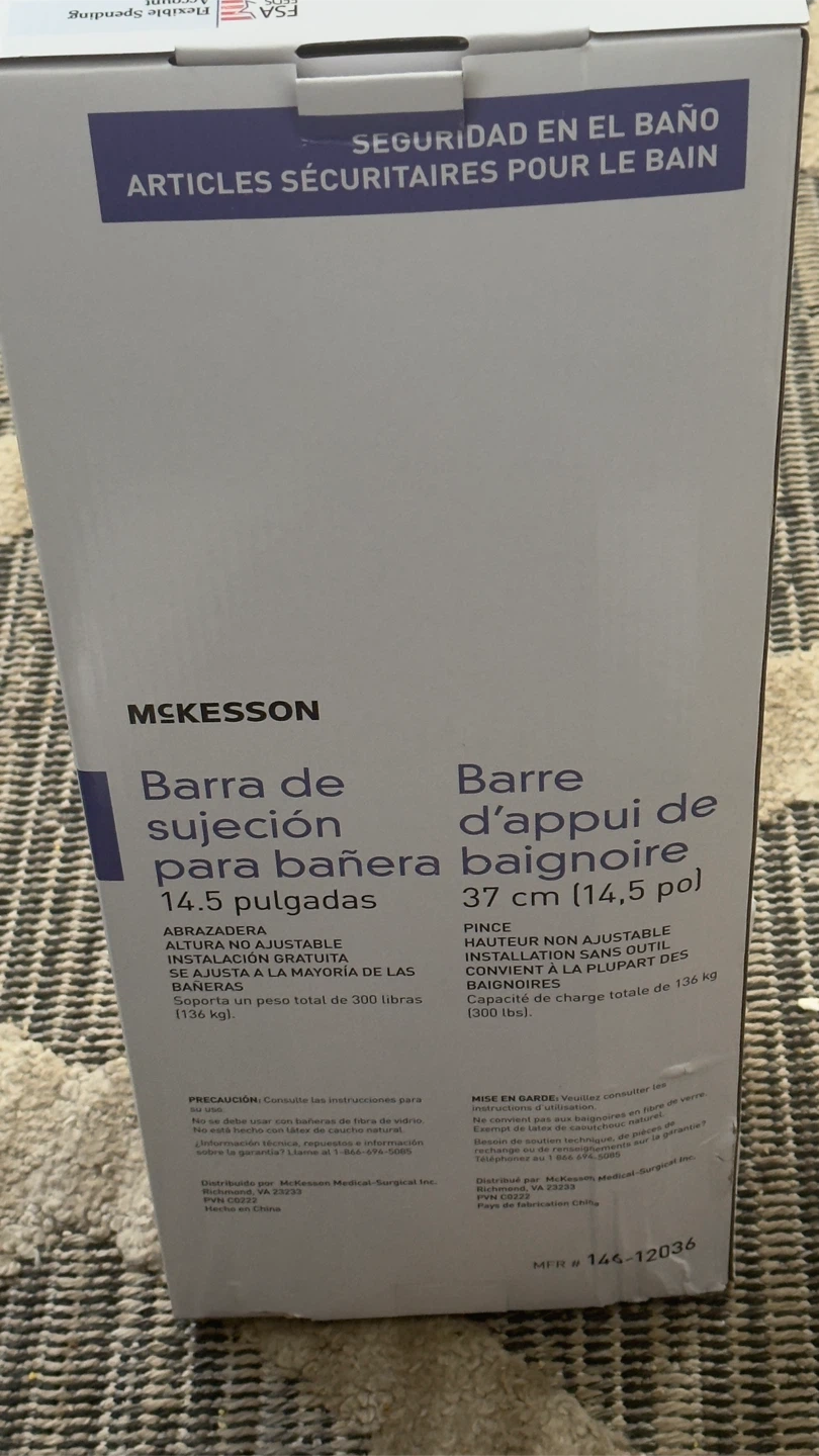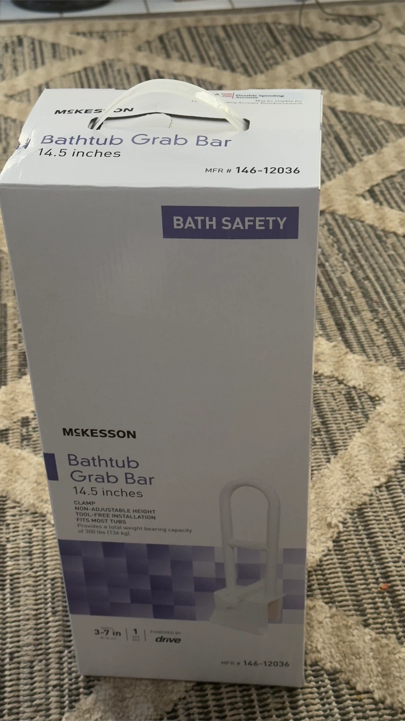 Selling a brand new McKesson Bathtub Grab Bar, still in its original box! This grab bar is 14.5 inches and features a clamp with adjustable height for tool-free installation on most tubs. It provides a total weight bearing capacity of 300 lbs (136 kg).