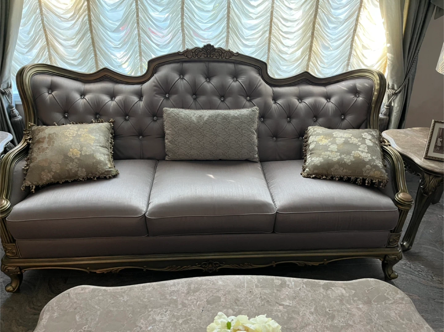Selling a beautiful grey tufted sofa that will add a touch of elegance to any living room. It's in great condition and ready for a new home. The neutral color makes it easy to match with any decor. Perfect for lounging and entertaining guests!