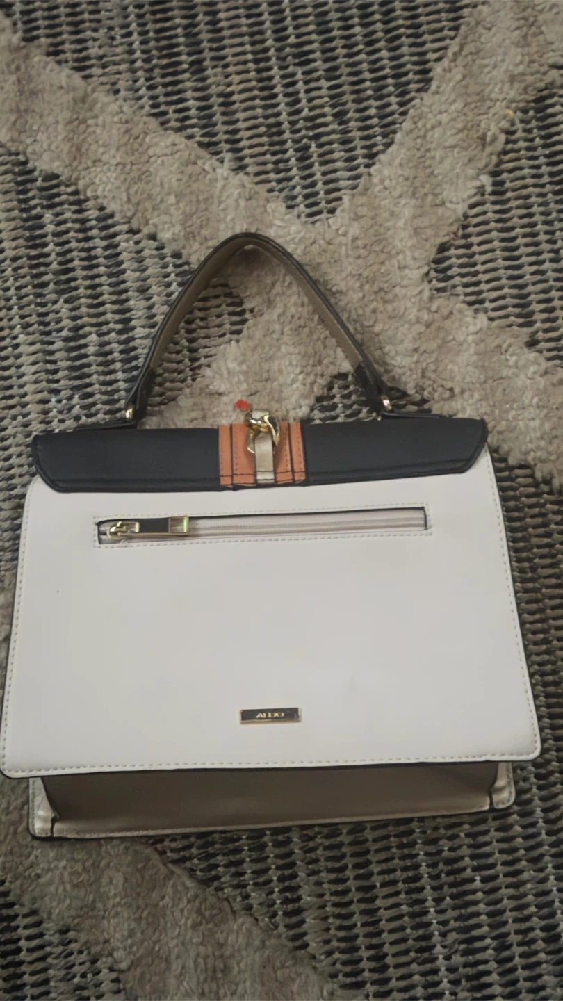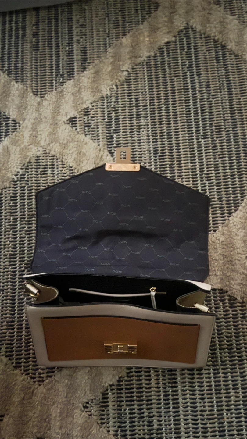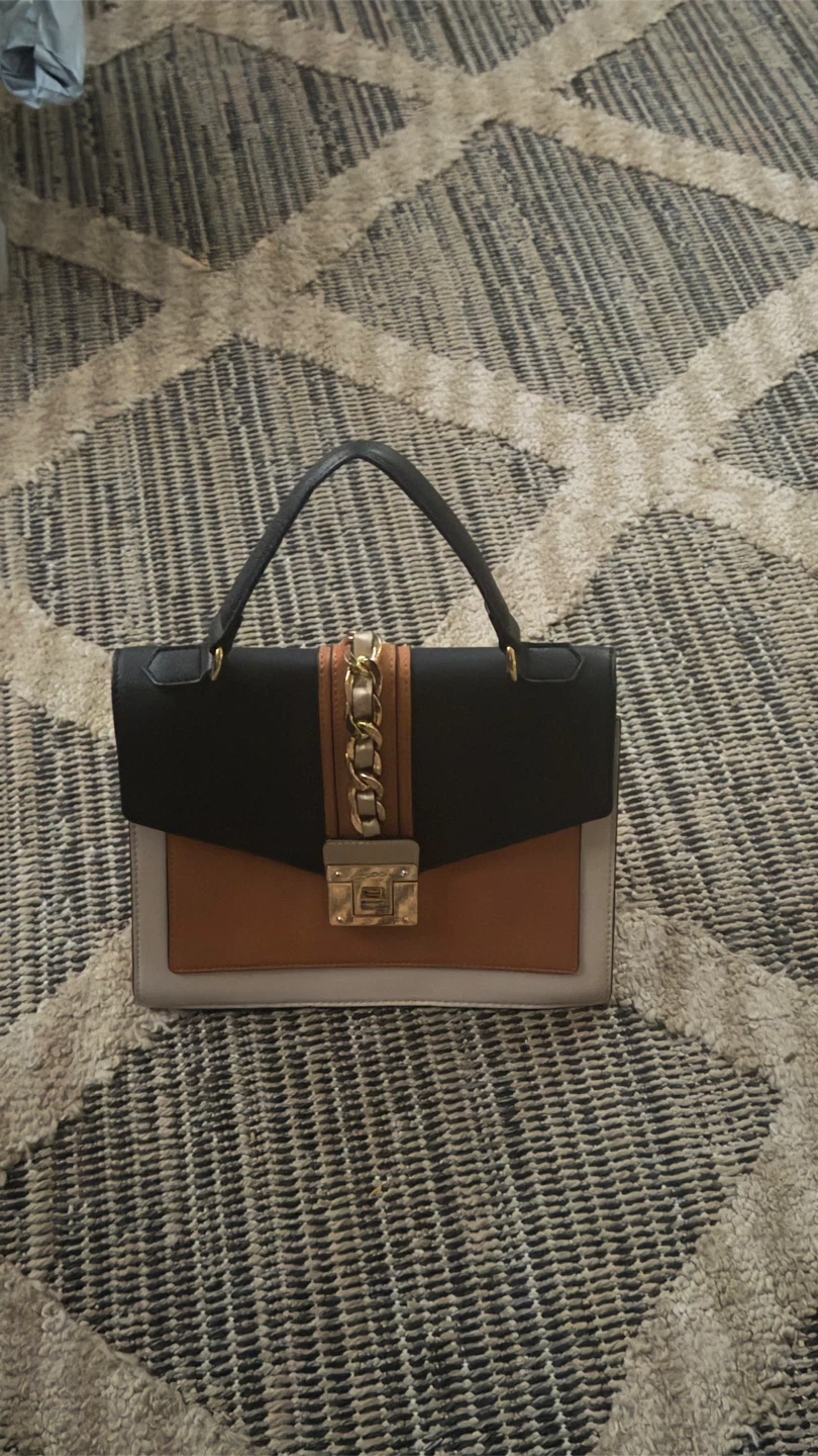 This is an ALDO satchel bag in a color block design. It features a black, brown, and beige color scheme with gold hardware. The bag has both a handle and a detachable strap. It's in great condition and ready for a new owner!