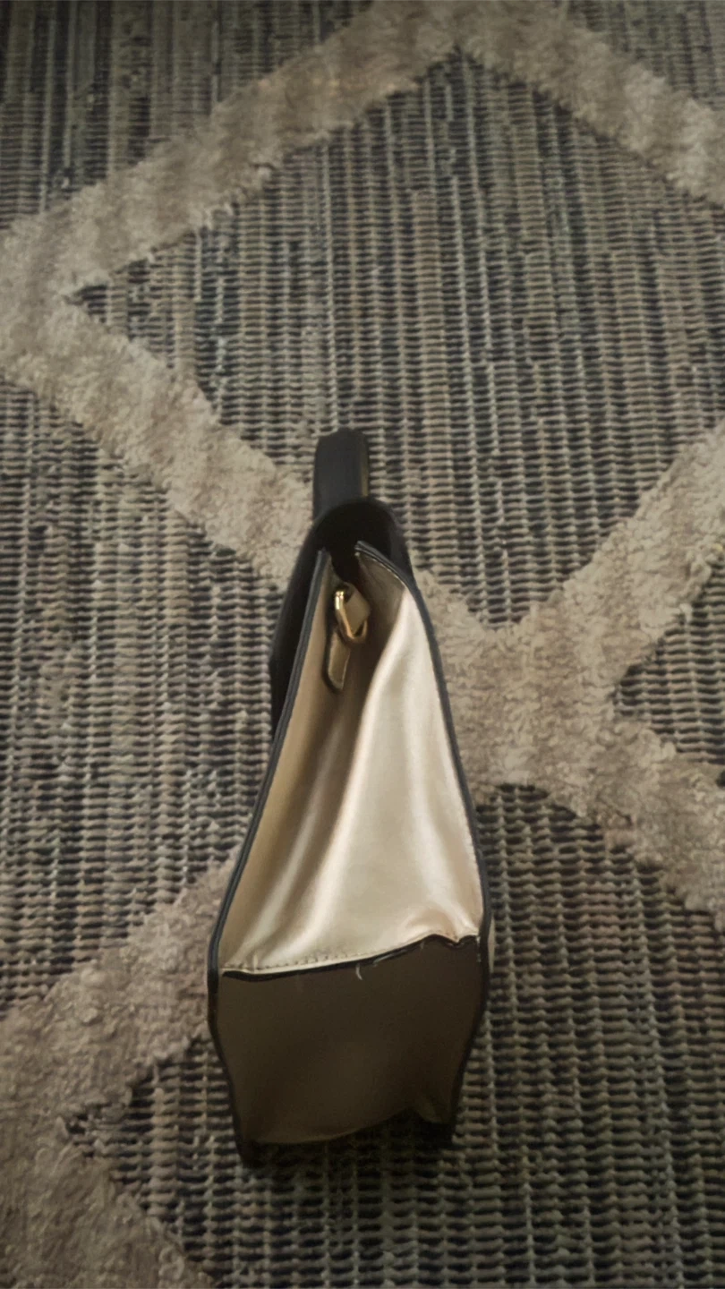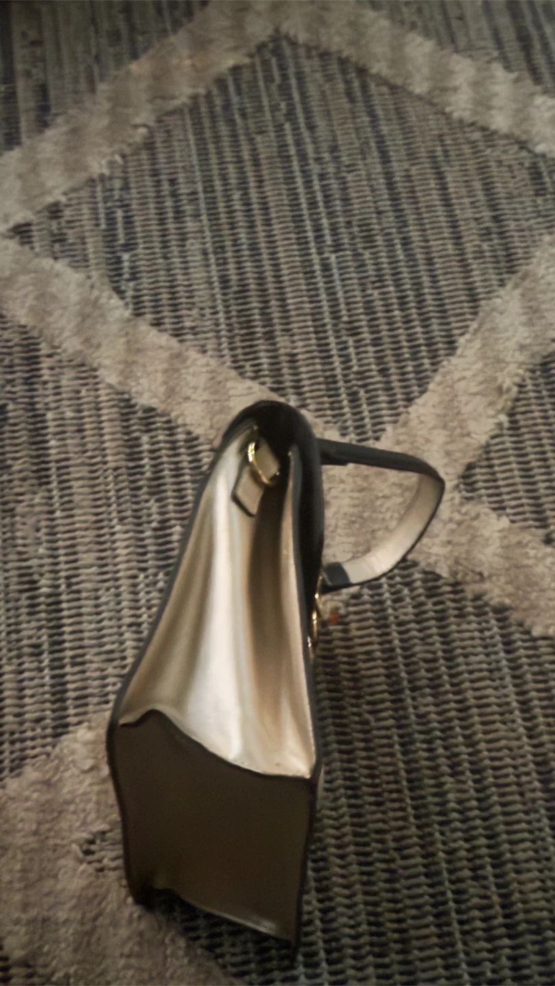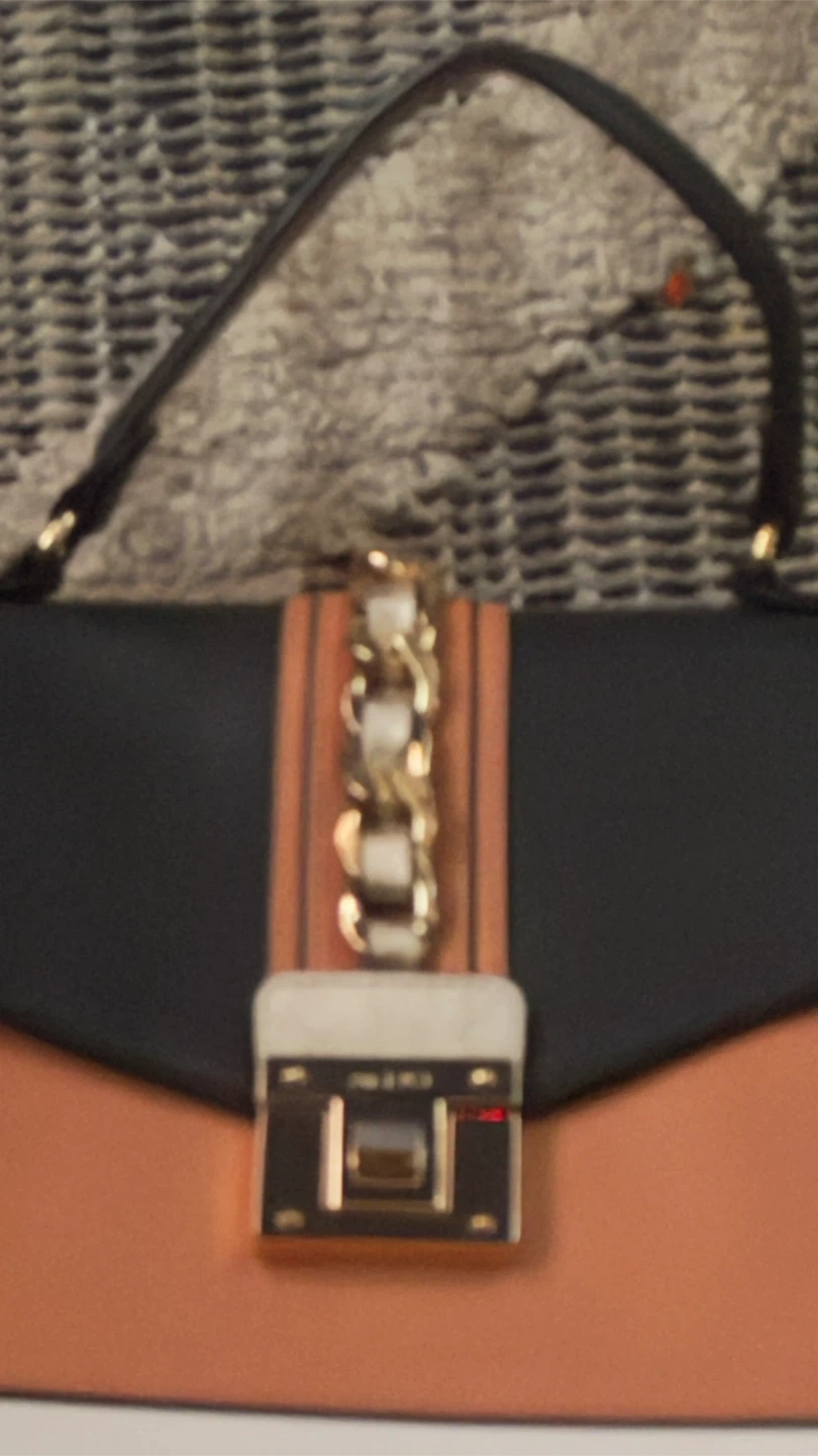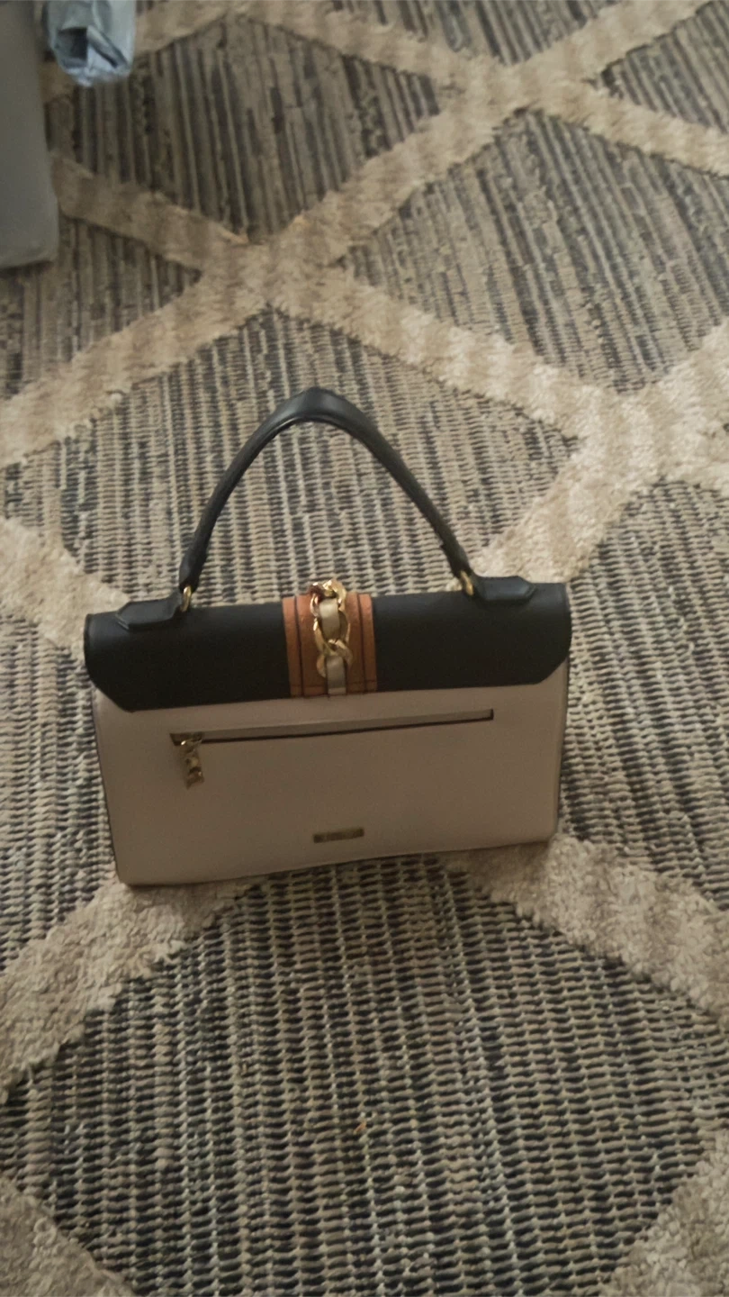 This is an ALDO satchel bag in a color block design. It features a black, brown, and beige color scheme with gold hardware. The bag has both a handle and a detachable strap. It's in great condition and ready for a new owner!