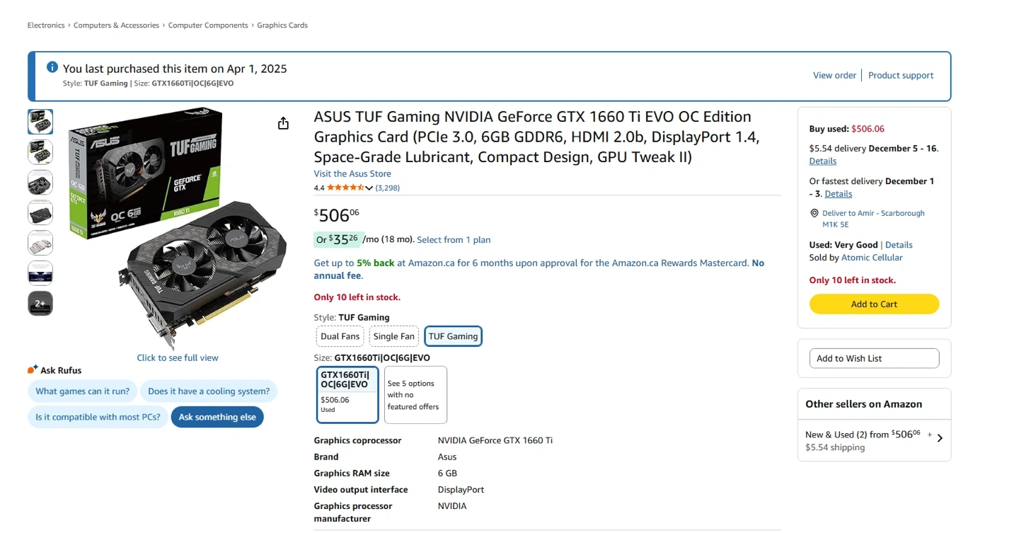 ASUS TUF Gaming NVIDIA GeForce GTX 1660 Ti EVO OC Edition Graphics Card (PCle 3.0, 6GB GDDR6, HDMI 2.0b, DisplayPort 1.4, Space-Grade Lubricant, Compact Design, GPU Tweak II)