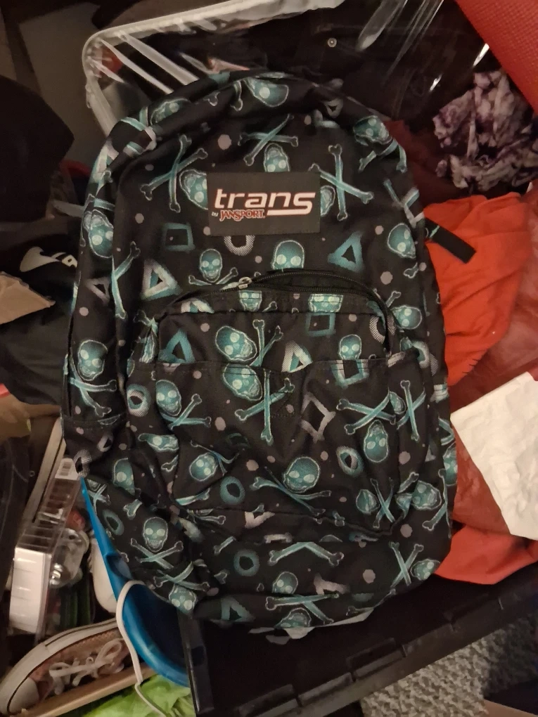 This is a JanSport backpack with a cool skull and crossbones print. The "trans by JanSport" logo is visible on the front. It's in good condition and ready for a new owner!