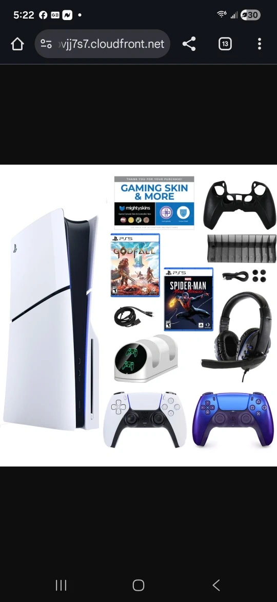 Selling a PlayStation 5 bundle! It includes the console itself, two controllers (one white, one blue/purple), a headset, a controller charging station, and the games Godfall and Spider-Man Miles Morales. Also included is a gaming skin. Brand new never opened