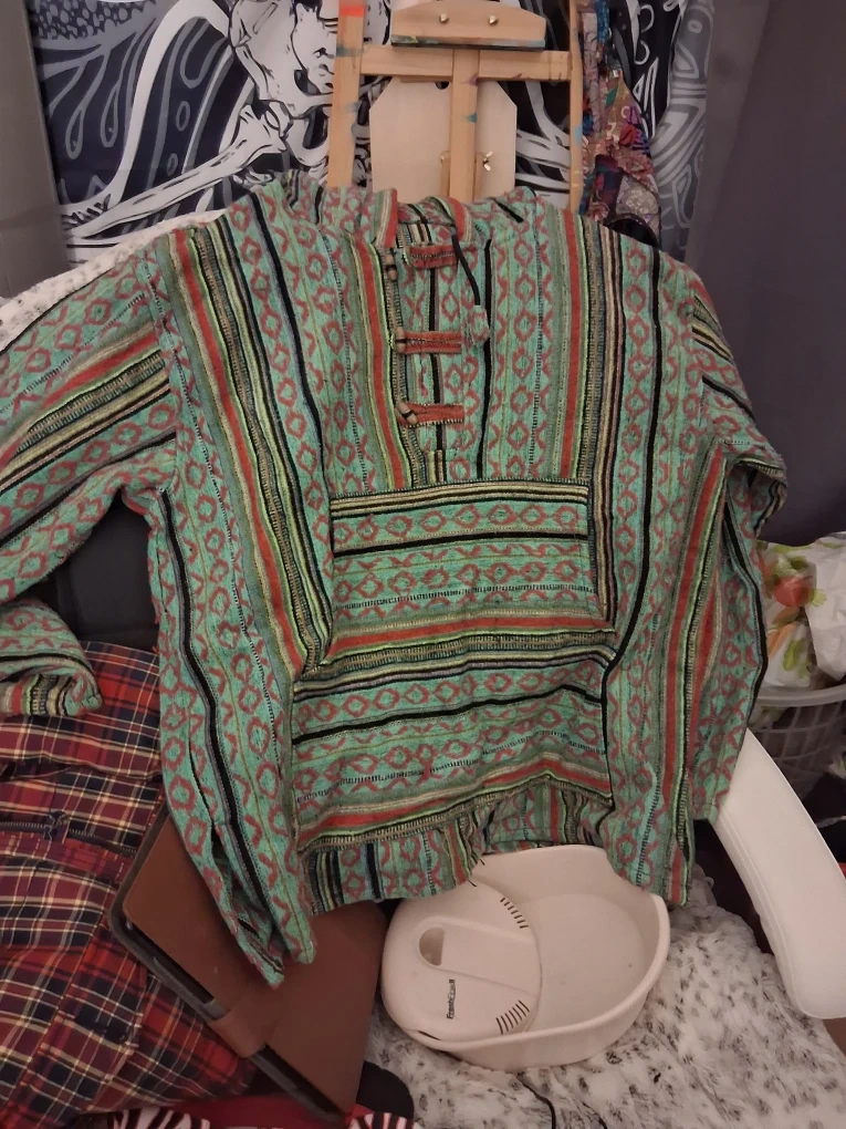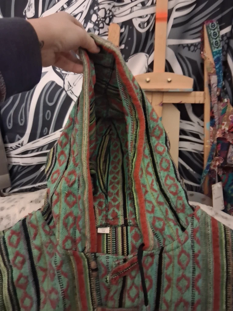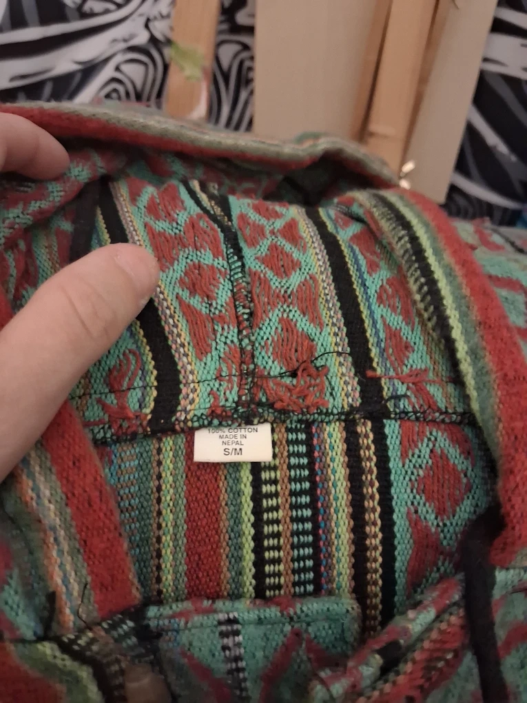 I'm selling a colorful, handmade hoodie made of 100% cotton from Nepal. It's marked as size S/M. This unique piece is perfect for adding a touch of global style to your wardrobe!