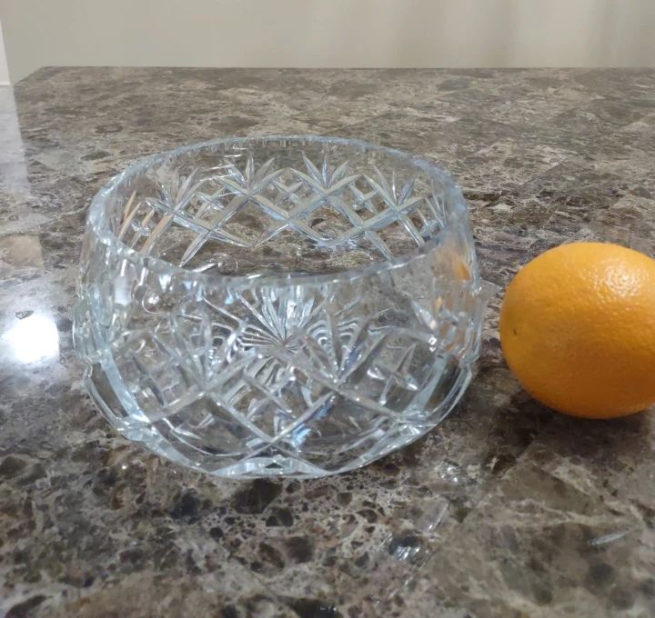Here's a lovely crystal bowl with a beautiful, intricate design! It would look great as a centrepiece or for serving snacks. It's in excellent condition and ready to add a touch of elegance to your home.