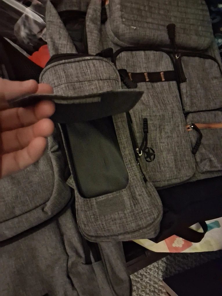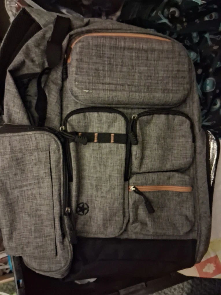 Selling a grey backpack with multiple pockets. It's in great condition and ready for a new owner! It has insulted pocket. It has a pocket for easy access to wet wipes.