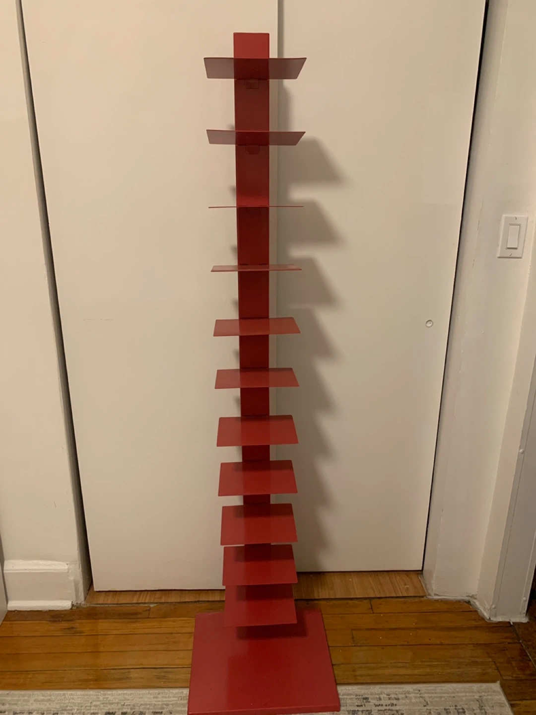 MAKE AN OFFER Here's a red metal stand that could be used for books or plants! It's in great shape and ready for a new home. It's a unique piece that would add a pop of color to any room