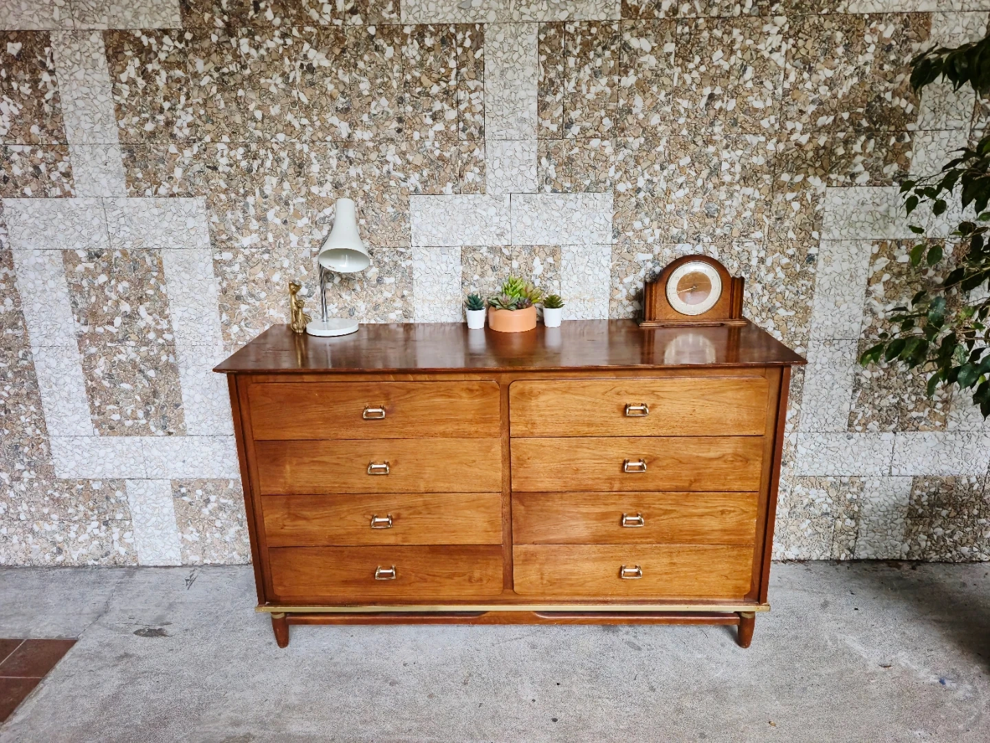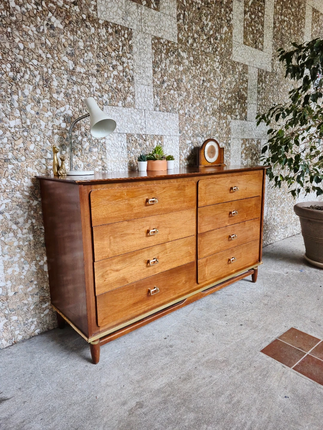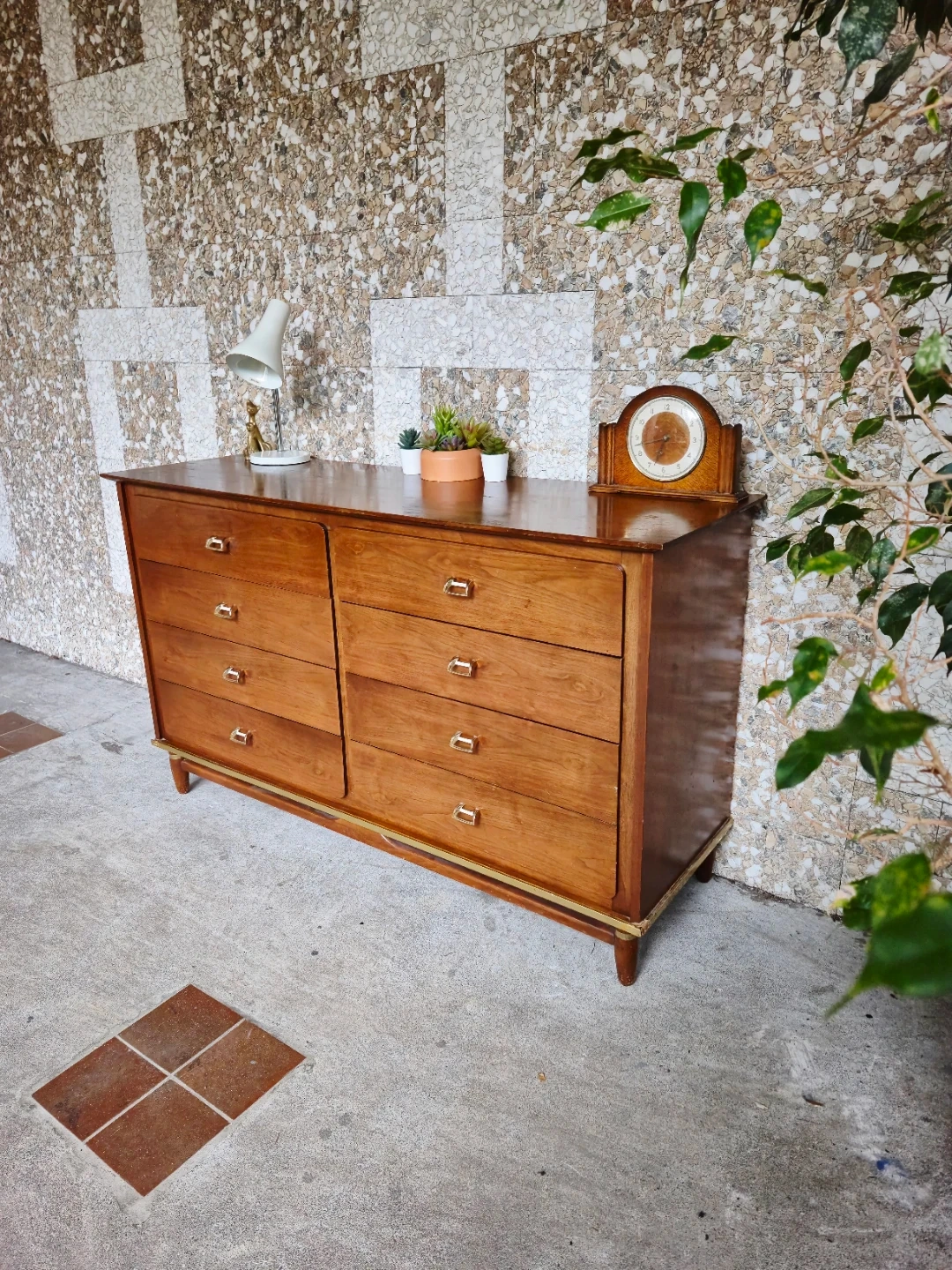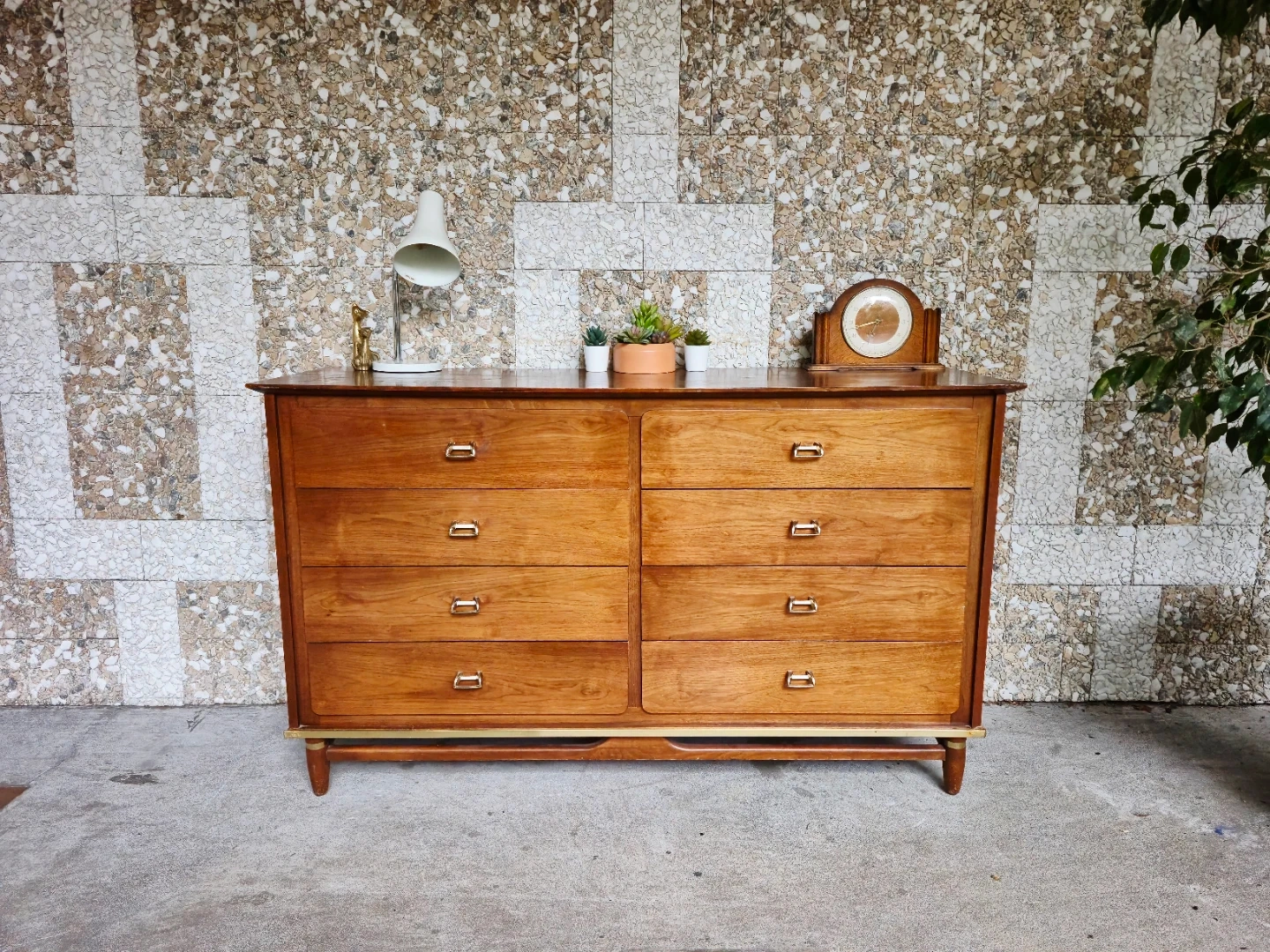 Made from walnut with a warm natural finish, it features 8 smooth-gliding drawers with brass-style pulls and classic tapered legs. The sleek, timeless design makes it a perfect fit for bedrooms, entryways, living spaces, or even as a TV/media console. Gold trim on the bottom left side has come off otherwise in good vintage condition.