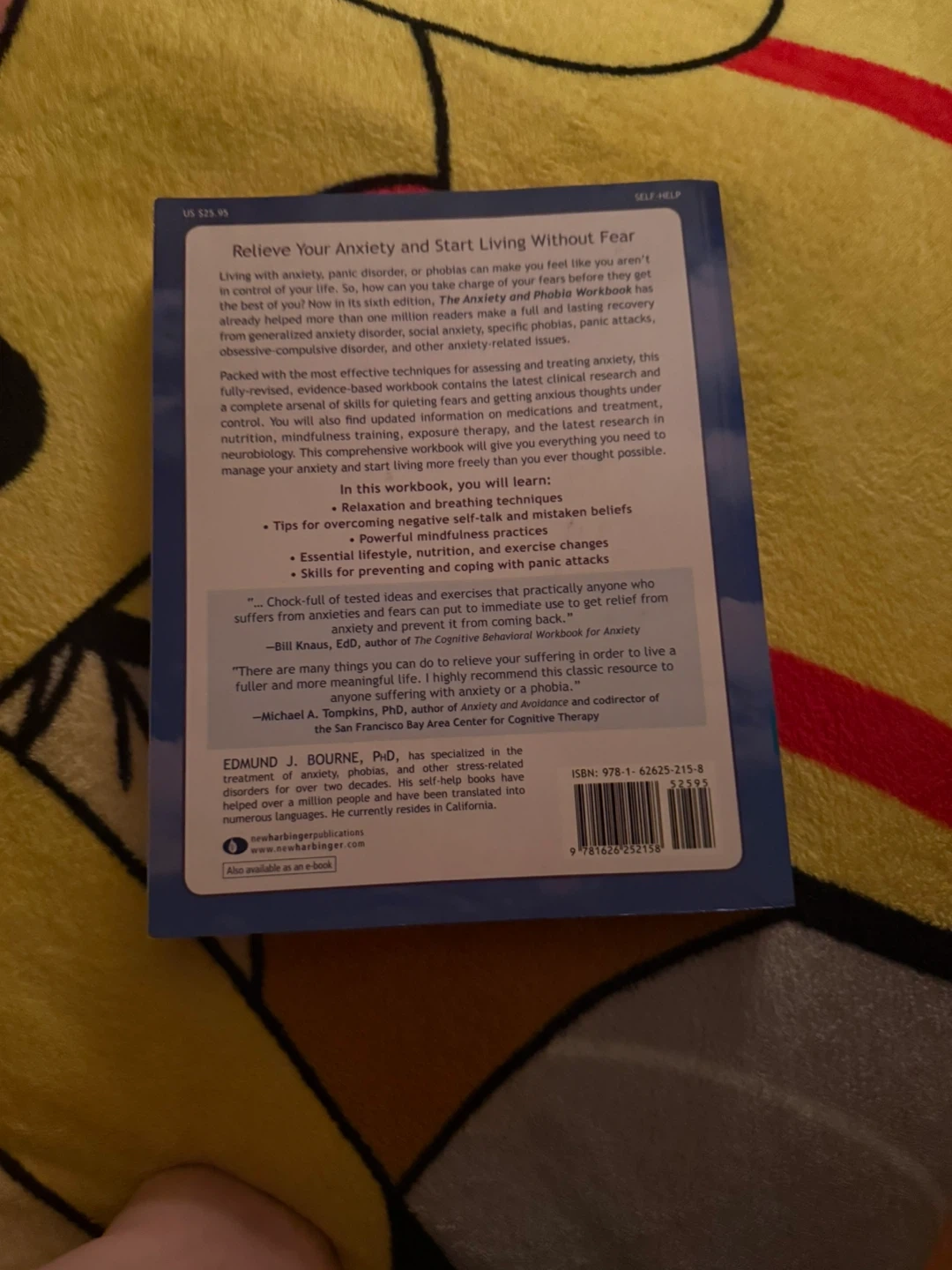 Selling 'The Anxiety & Phobia Workbook,' Sixth Edition by Edmund J. Bourne, PhD. It's a practical, step-by-step guide that covers relaxation, exercise, and coping with panic. It also includes new research on exposure, overcoming negative self-talk, changing mistaken beliefs, mastering specific phobias, nutrition, medication, meditation techniques, and easing health-related anxiety, selling to help for groceries. Thank you.