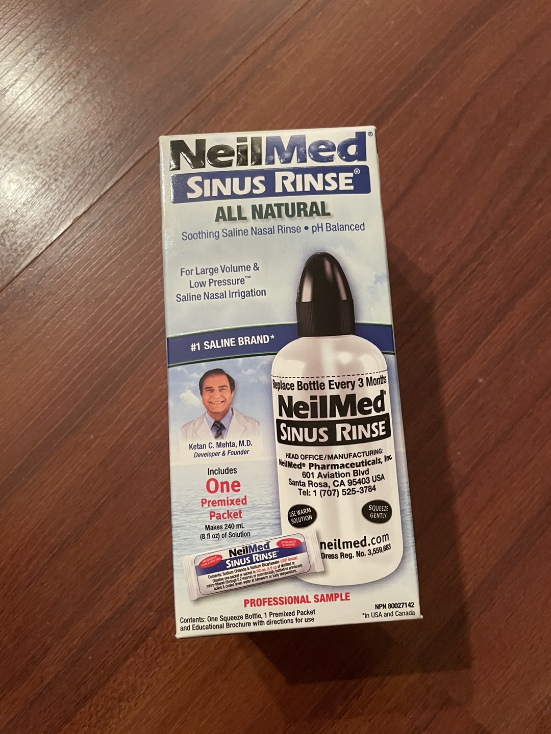 NeilMed Sinus Rinse kit that is all natural. It's designed for large volume and low-pressure saline nasal irrigation. This kit includes one squeeze bottle and one premixed packet to make 240 mL of solution, along with an educational brochure