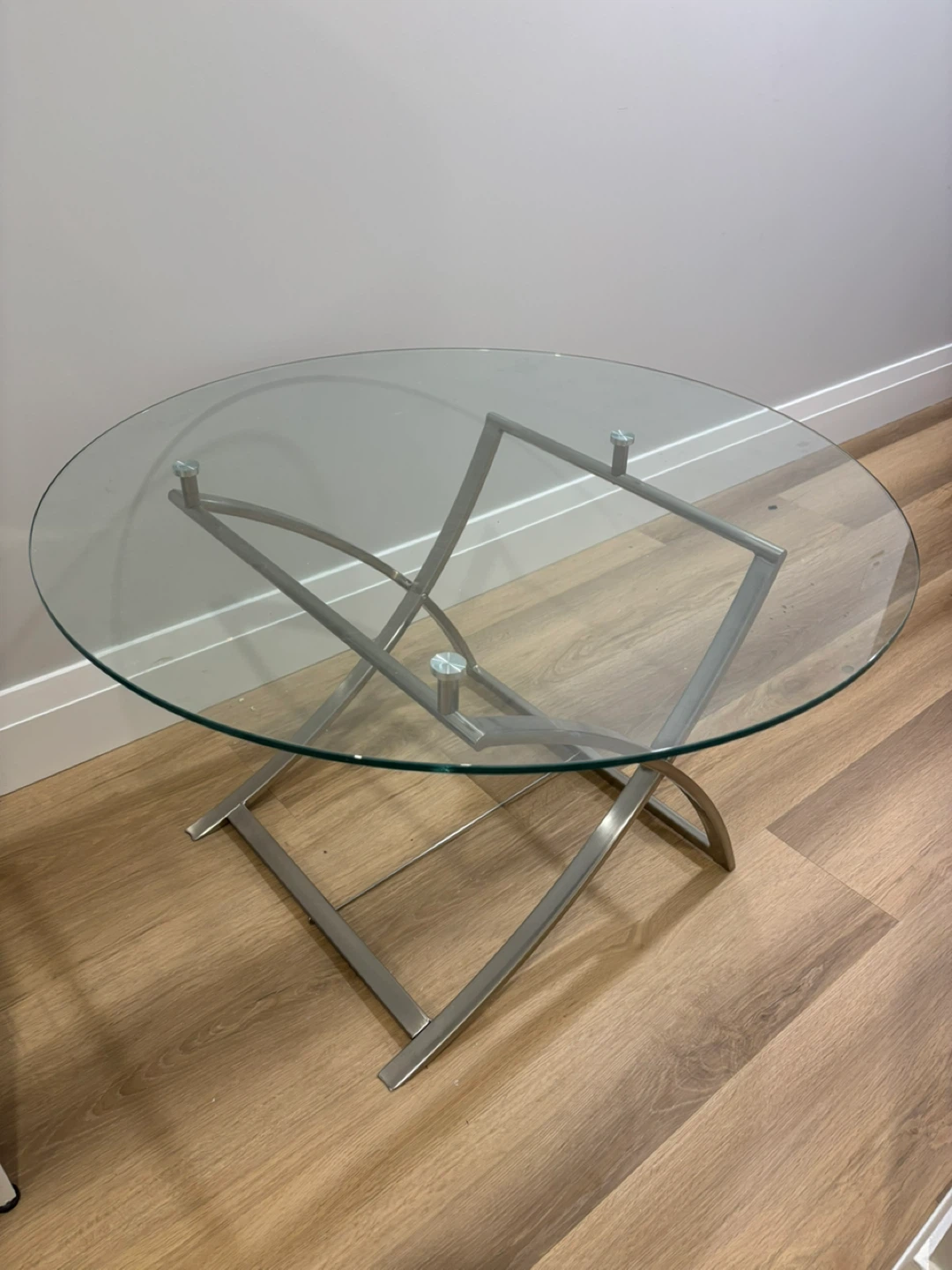 Selling a stylish glass top coffee table! It has a unique metal base and would look great in any living room or bedroom. It's in good condition and ready for a new home!