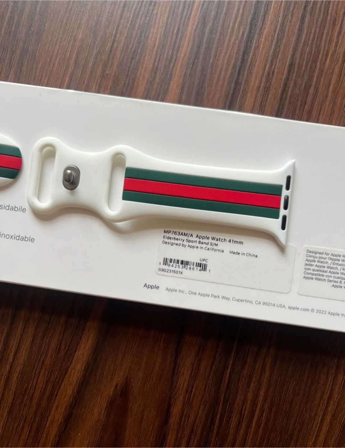 This is an Apple Watch 41mm Elderberry Sport Band in size S/M. The model number is MP763AM/A. It features a sport band with a stainless steel pin