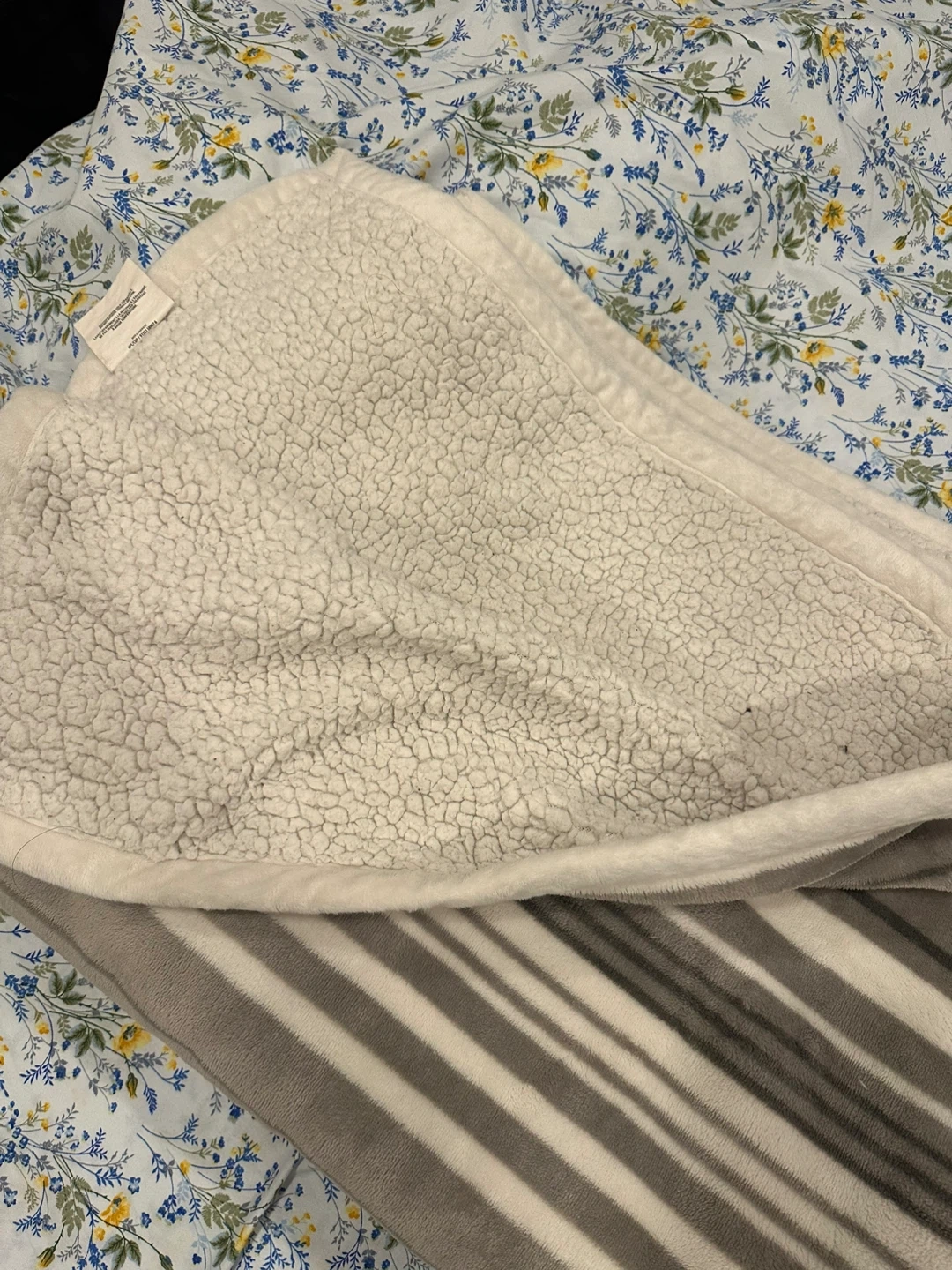 Selling a cozy throw blanket with a striped pattern in grey and white! It's super soft and perfect for snuggling up on the couch. The material feels like a plush fleece, so it’s sure to keep you warm during these chilly evenings
