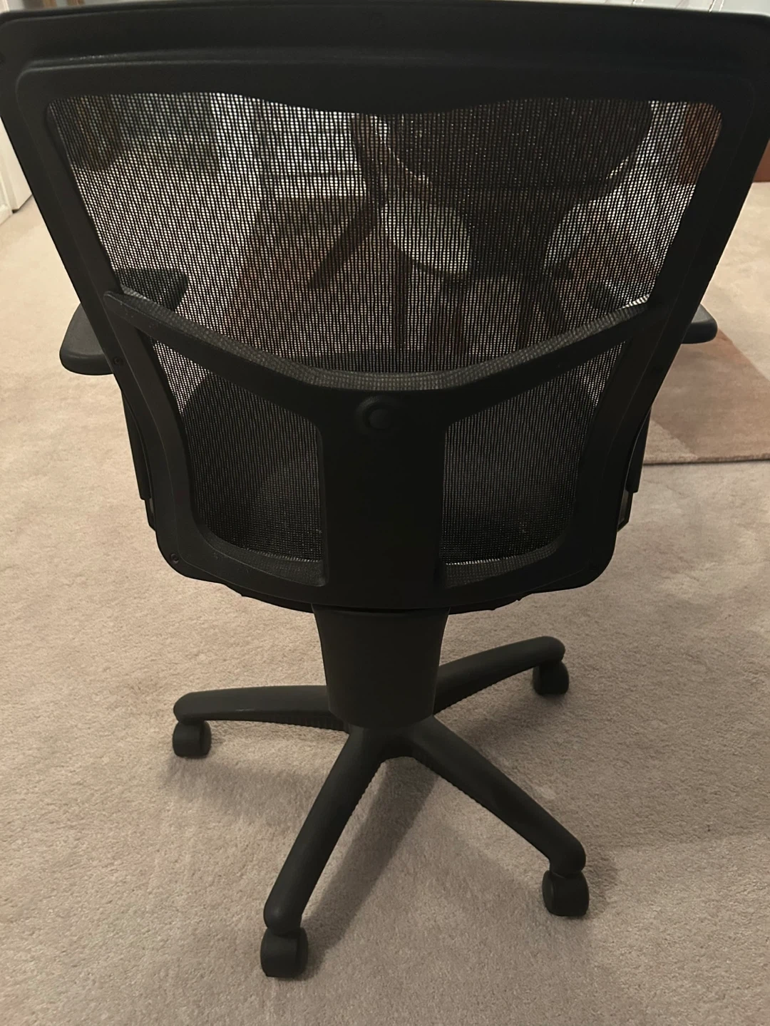 Used black office chair in great condition. It features a mesh back and padded seat for comfort during long work sessions. Adjustable height with wheels for easy transport. Comes with extra wheels & back padded support not shown . Smoke free pet free home.