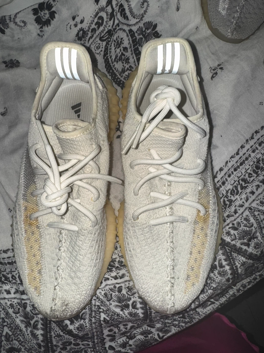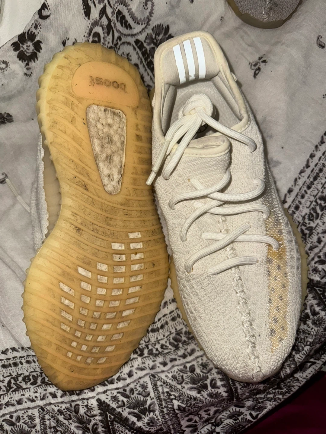 Selling a pair of Adidas Yeezy Boost 350 V2 in the Cream colorway. These shoes have been worn, as you can see from the soles, but they still have plenty of life left! The iconic Boost cushioning provides all-day comfort, and the stylish design will turn heads wherever you go