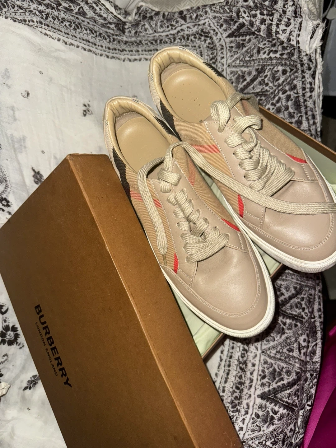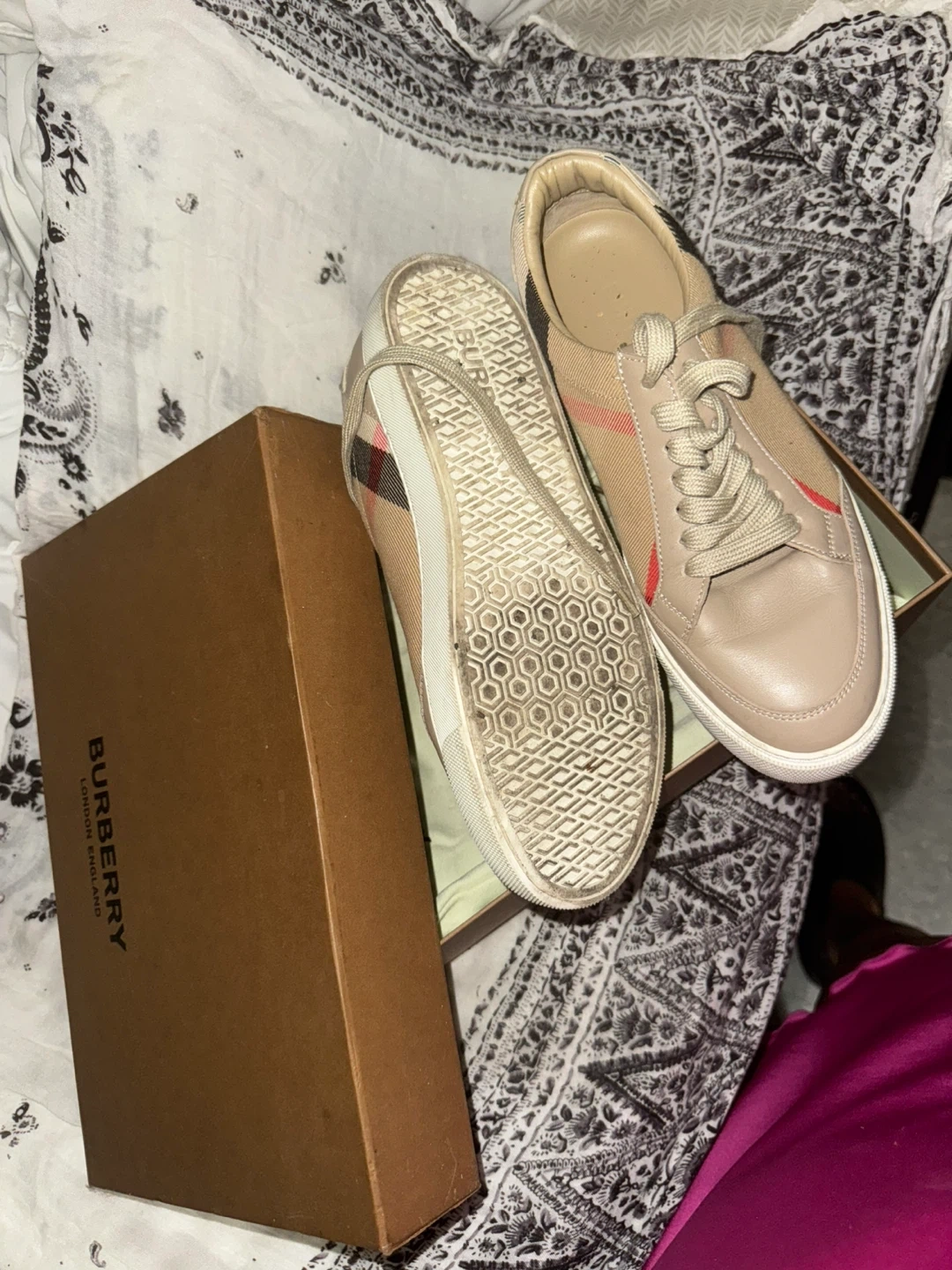 These Burberry sneakers are in good condition and come with the original box! They feature the classic Burberry plaid design. Perfect for adding a touch of luxury to your everyday style