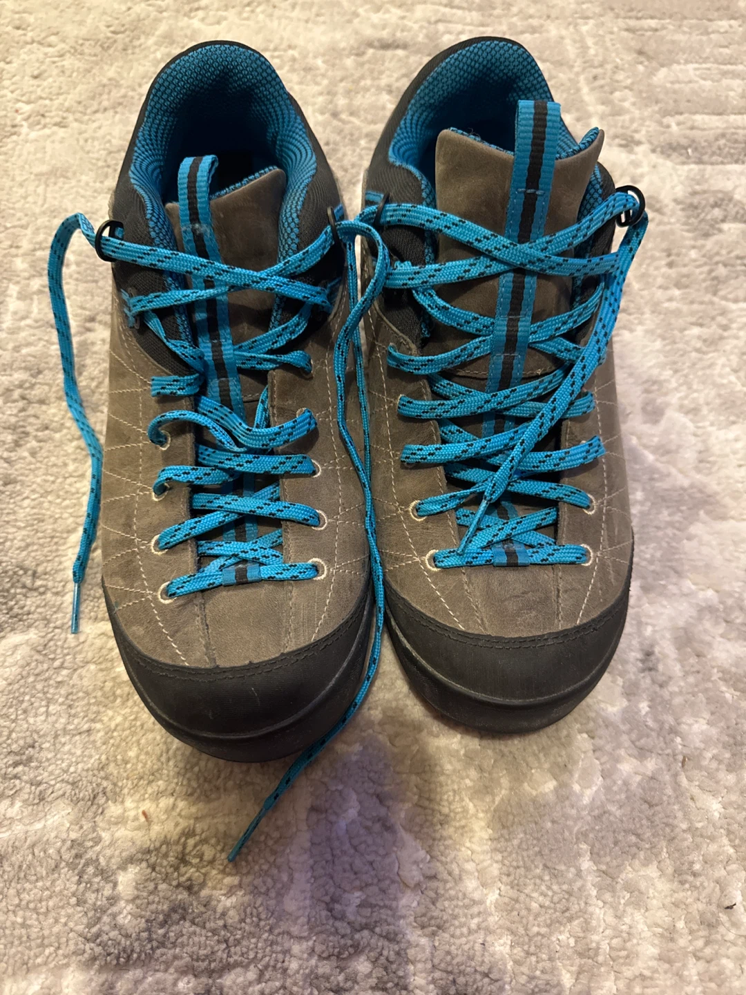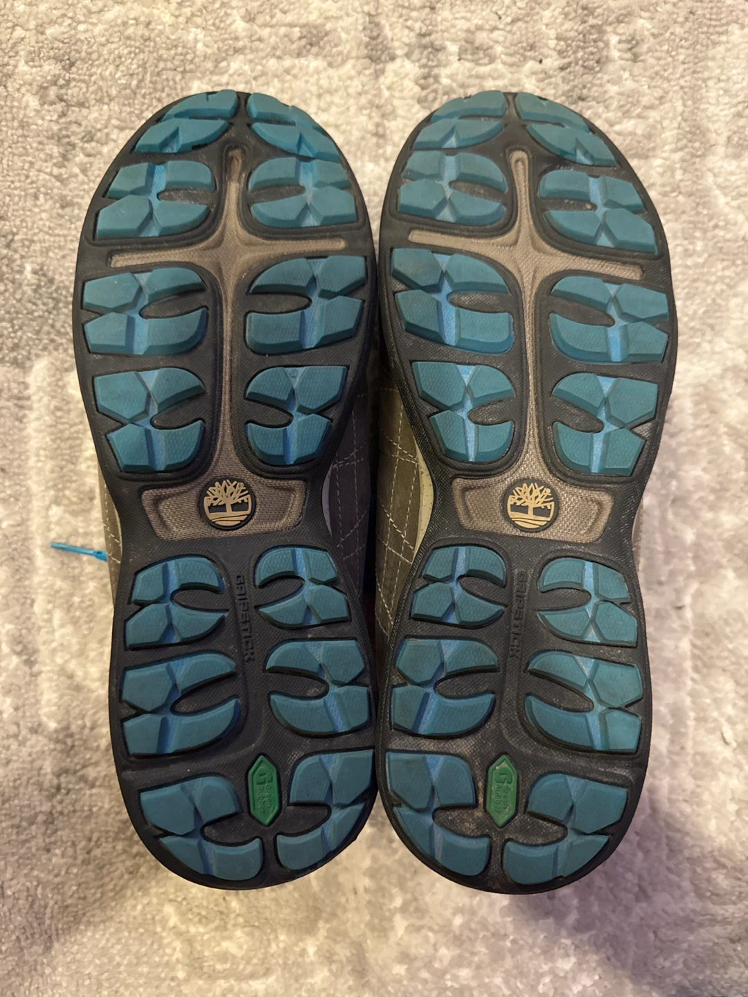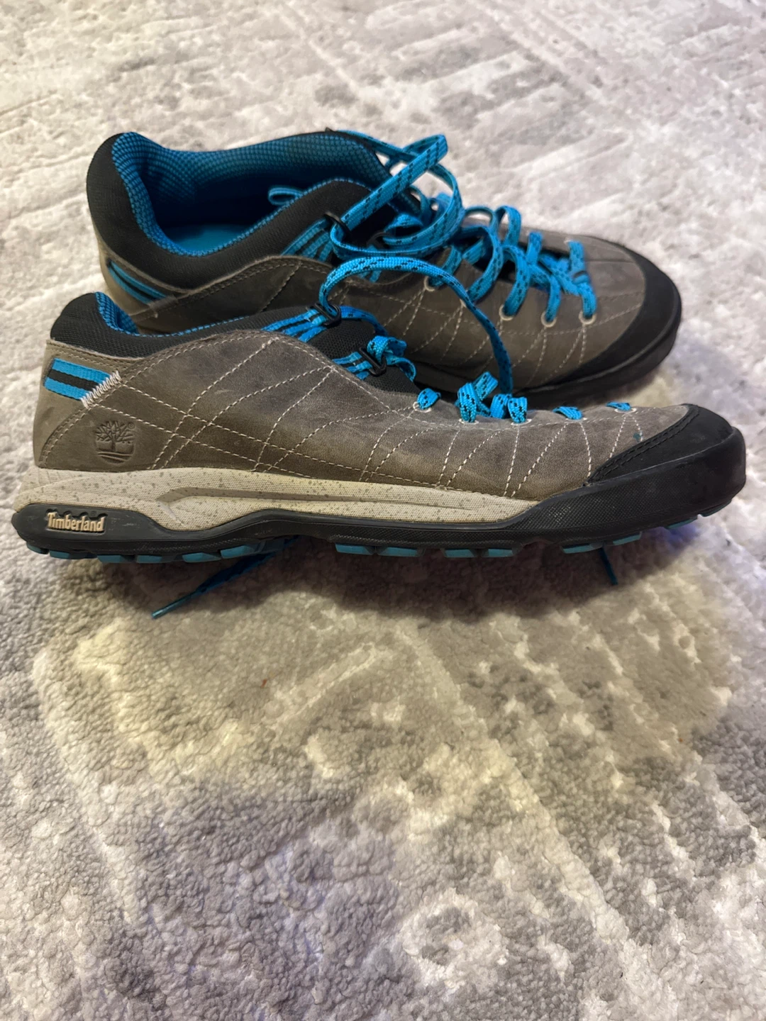 Men’s Timberland hiking shoes 8.5US (42EU) in a grey and blue colour scheme! They have a rugged sole and are perfect for light hiking or just walking around town.