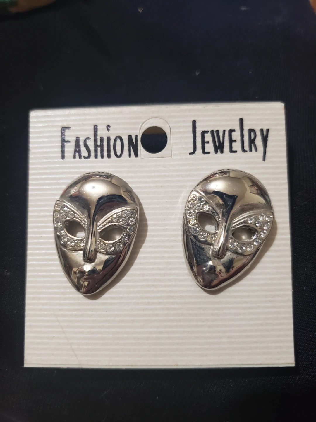Here are a pair of Fashion Jewelry silver mask earrings. They have some rhinestones around the eyes. The earrings are in new condition and come with the original backing card