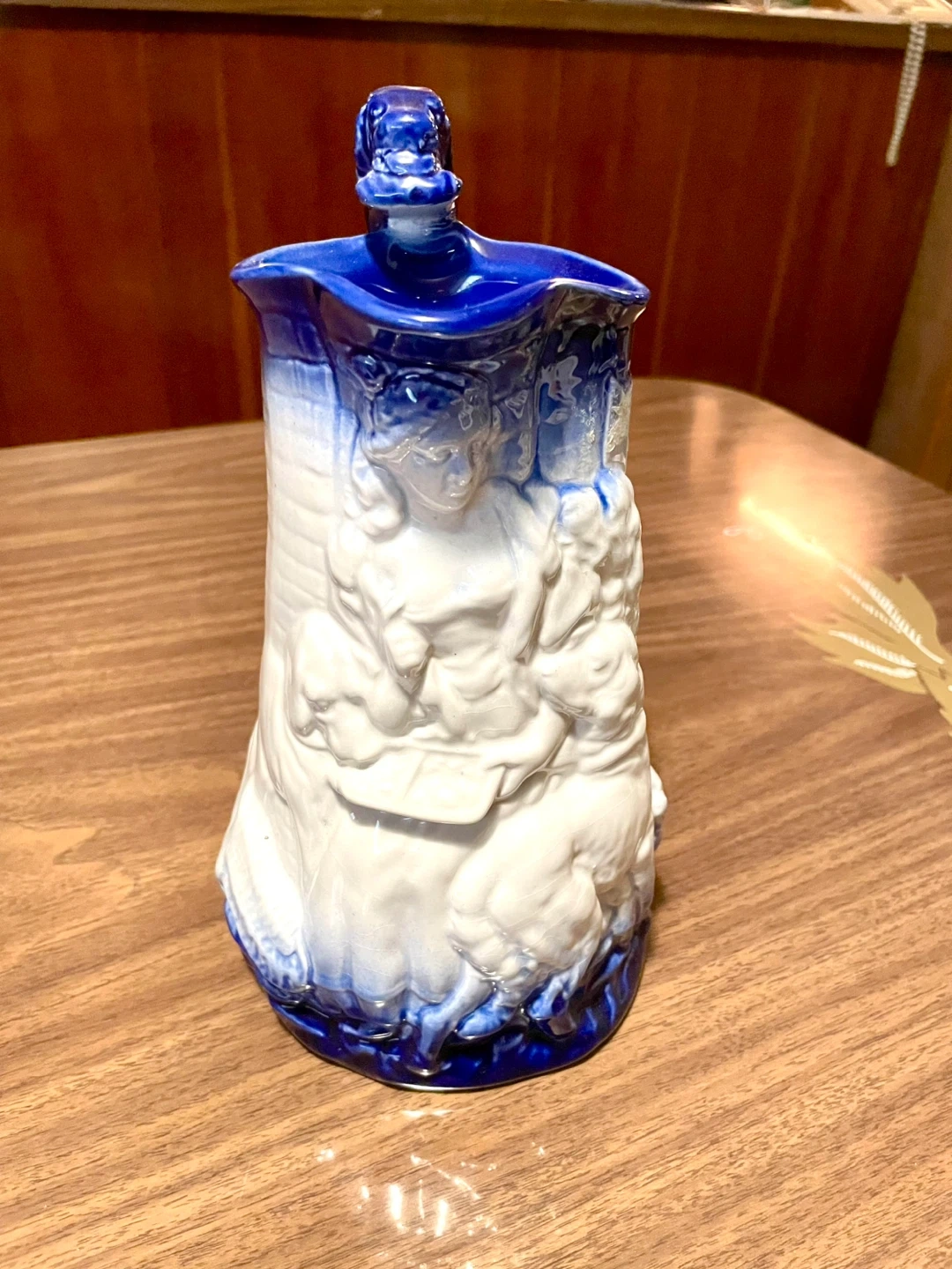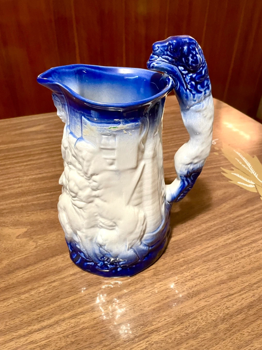 This is a rare vintage Burleigh Ironstone Staffordshire blue and white pitcher featuring a figural scene of a female and two dogs and a dog-form handle.