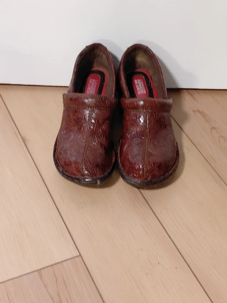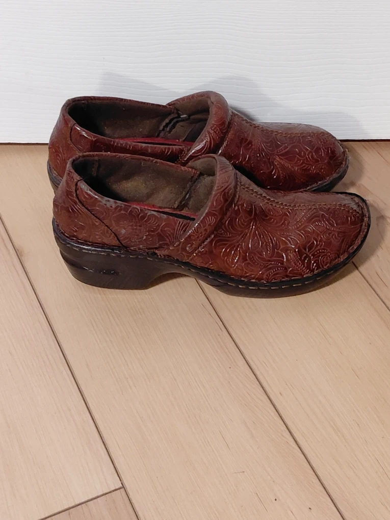 These are a pair of brown leather clogs from Born. They have a nice floral pattern on the leather. These shoes are in good condition and ready for a new owner! Only worn once. Too small for wide foot.