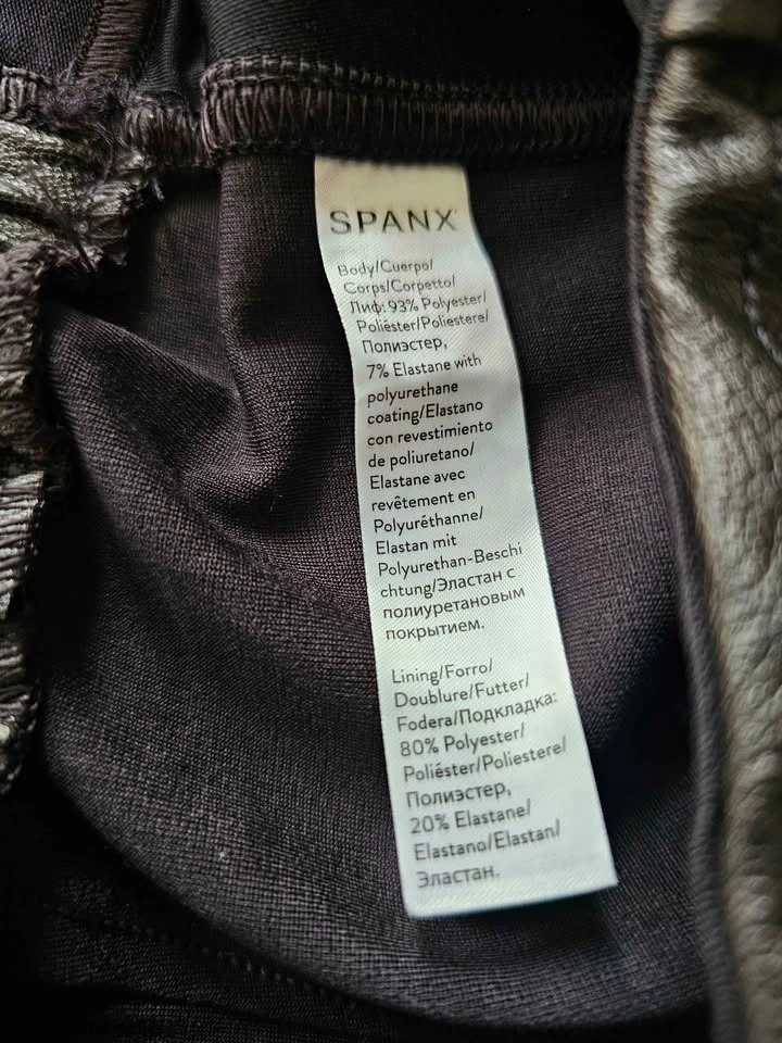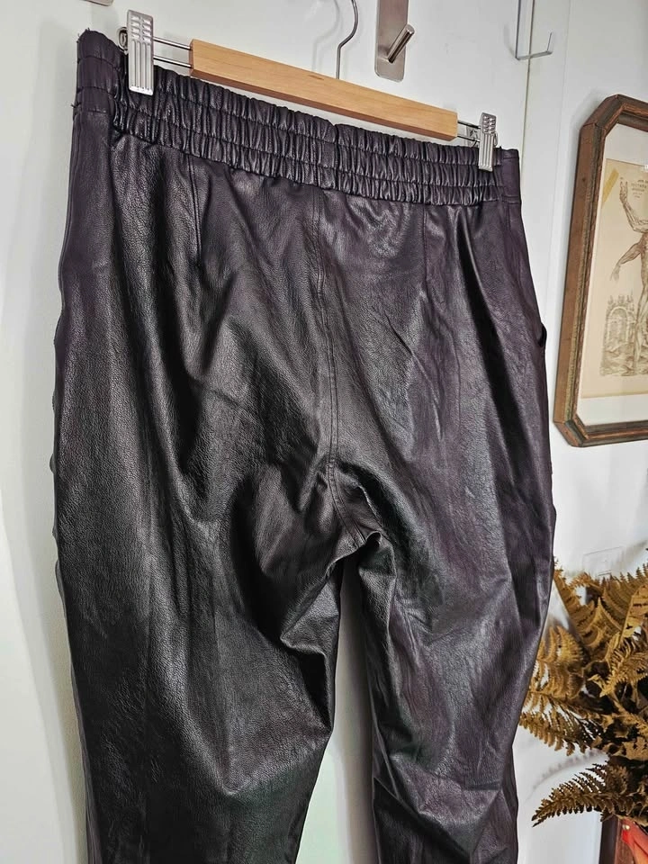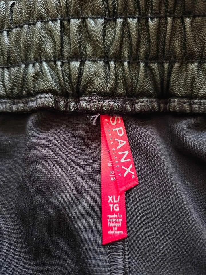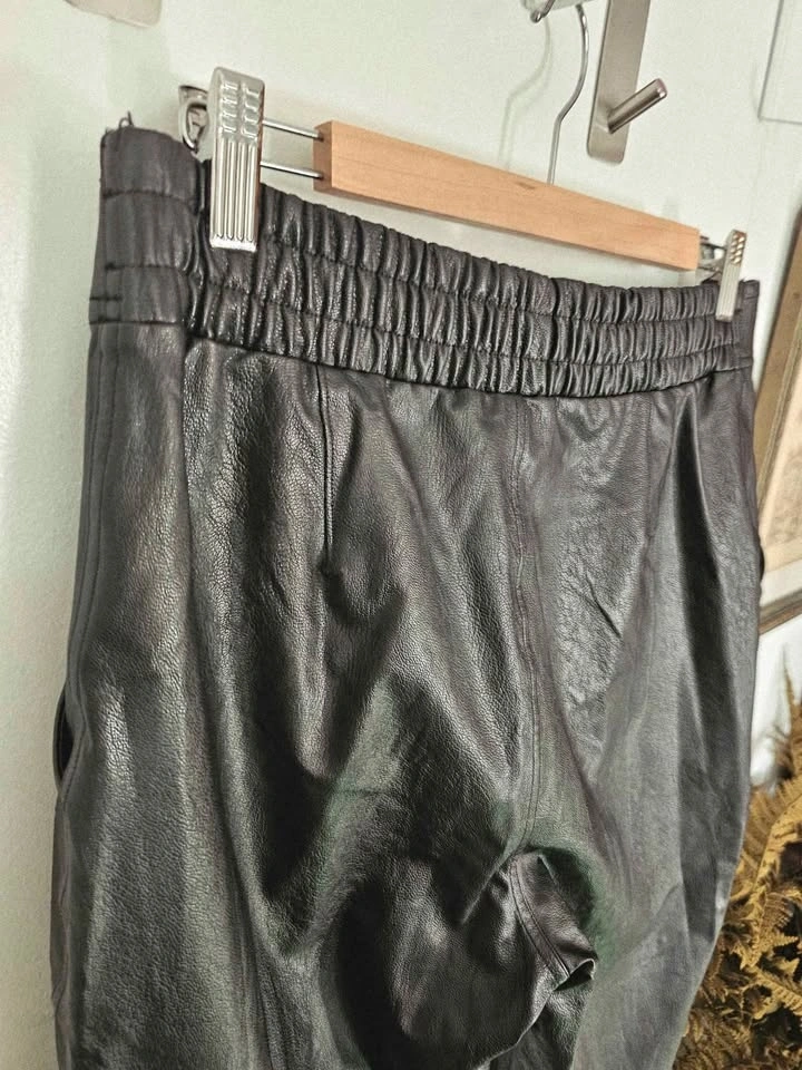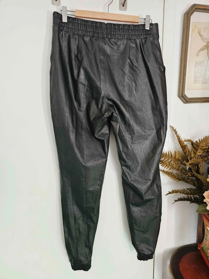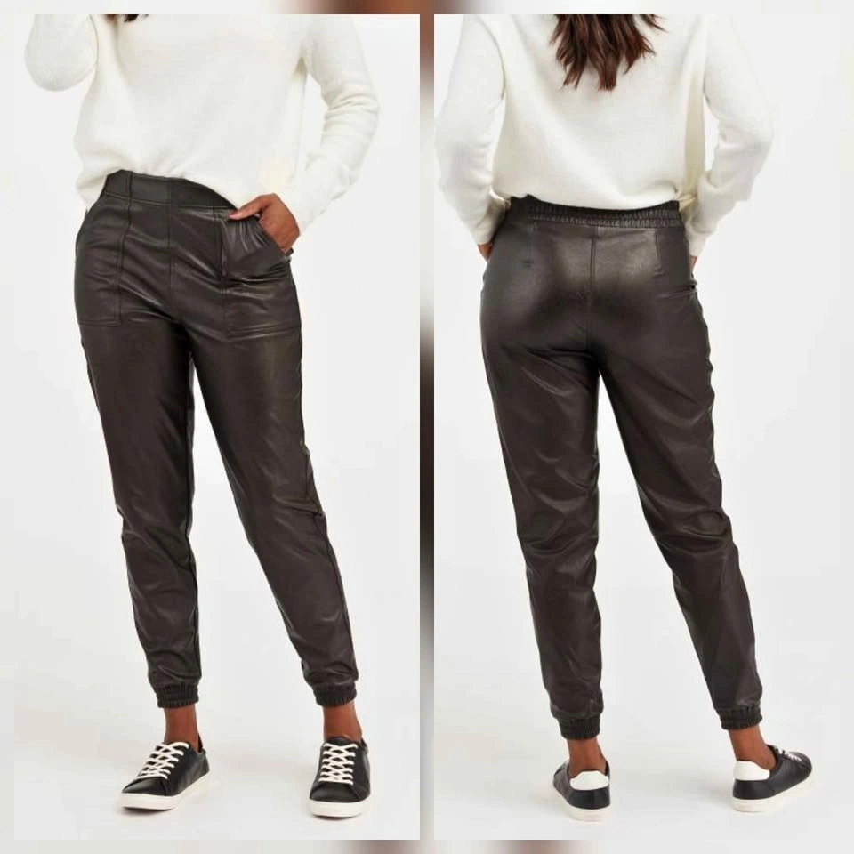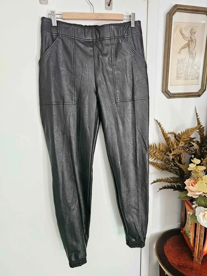 Sleek black Leather-Like faux leather jogger pants from Spanx. Made of a soft, shaping and stretchy material, with a comfortable elasticized waistband. Tapered style with elastic at the ankles. Pants have 2 front patch pockets.