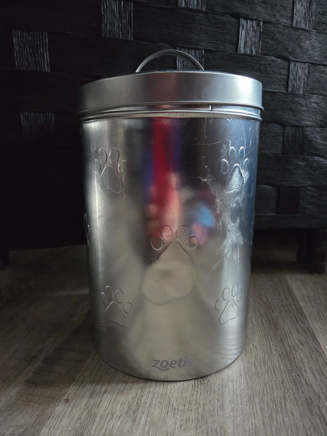 Free Zoetis canister. It's got a cute paw print design all over it. Perfect for storing pet treats or other items!