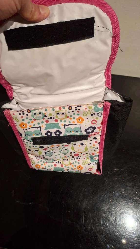 Here's a cute lunch bag with a fun owl pattern! It's perfect for kids or anyone who loves owls. The bag is black with a colourful owl design and pink trim. It has a velcro closure to keep everything secure.