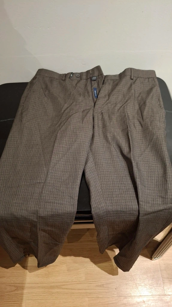 Here are a pair of Haggar pants in a brown plaid pattern. They appear to be in good condition and ready for a new home!
