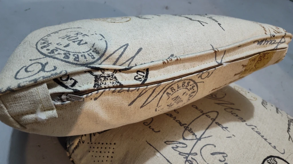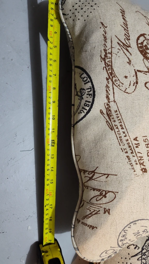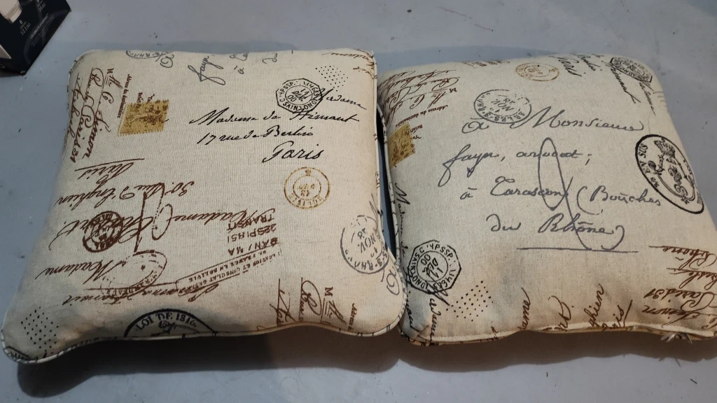 Selling a set of 2 LARGE decorative throw pillows. They have a unique design with what looks like vintage French script and postmarks. They measure approximately 17 INCHES in length and 17 INCHES in width, making them a great size for adding a touch of style to any sofa or bed!