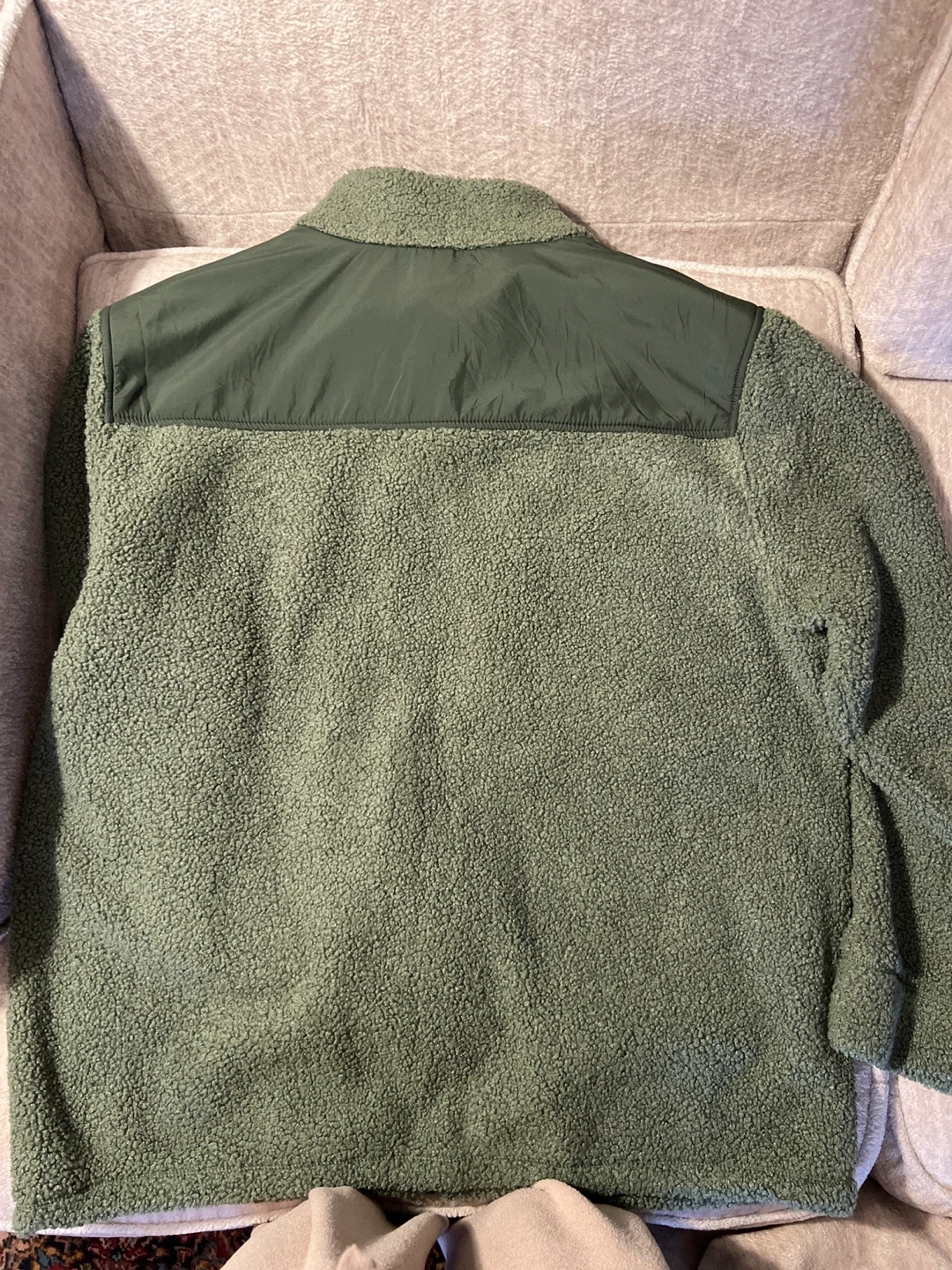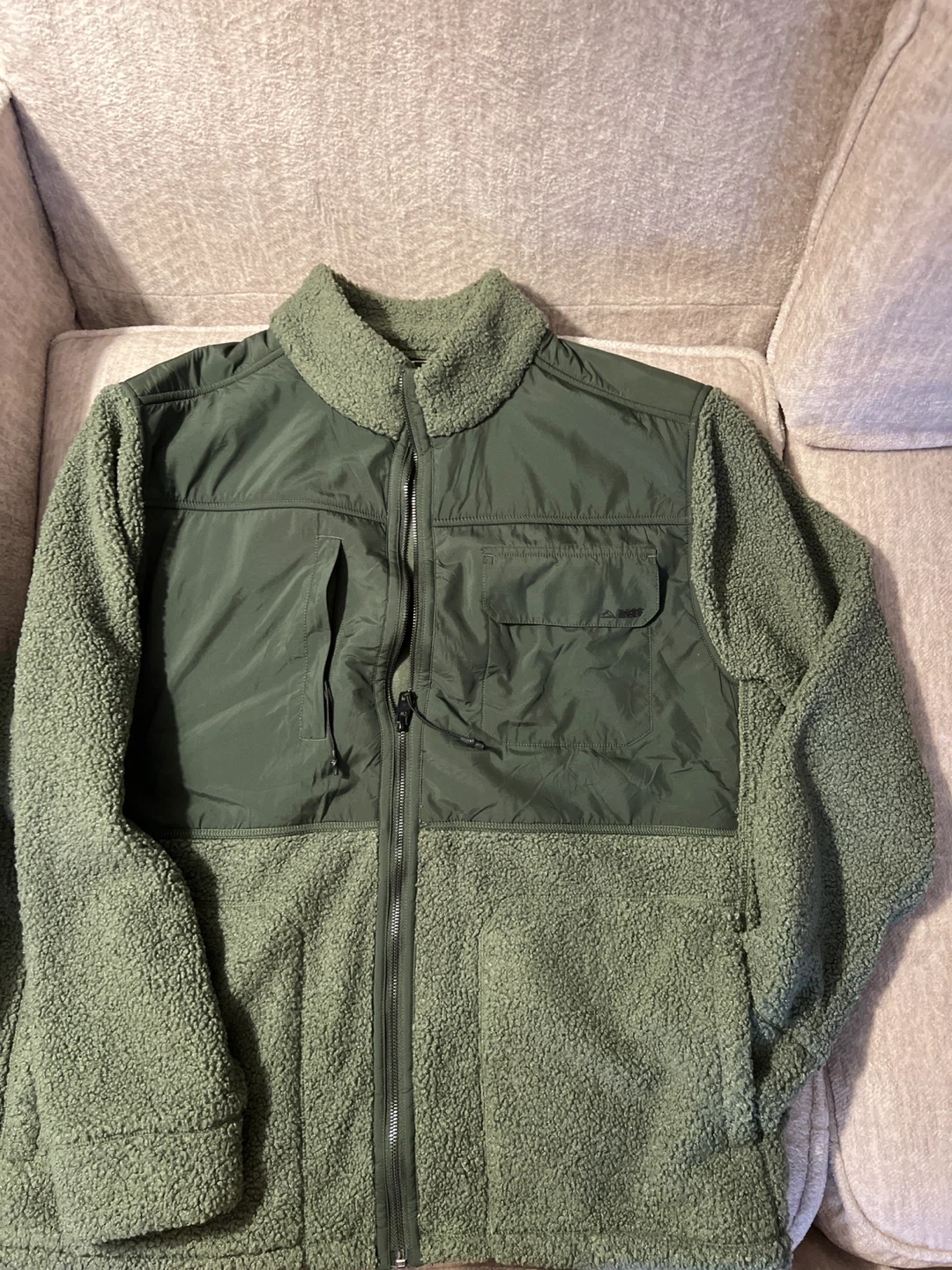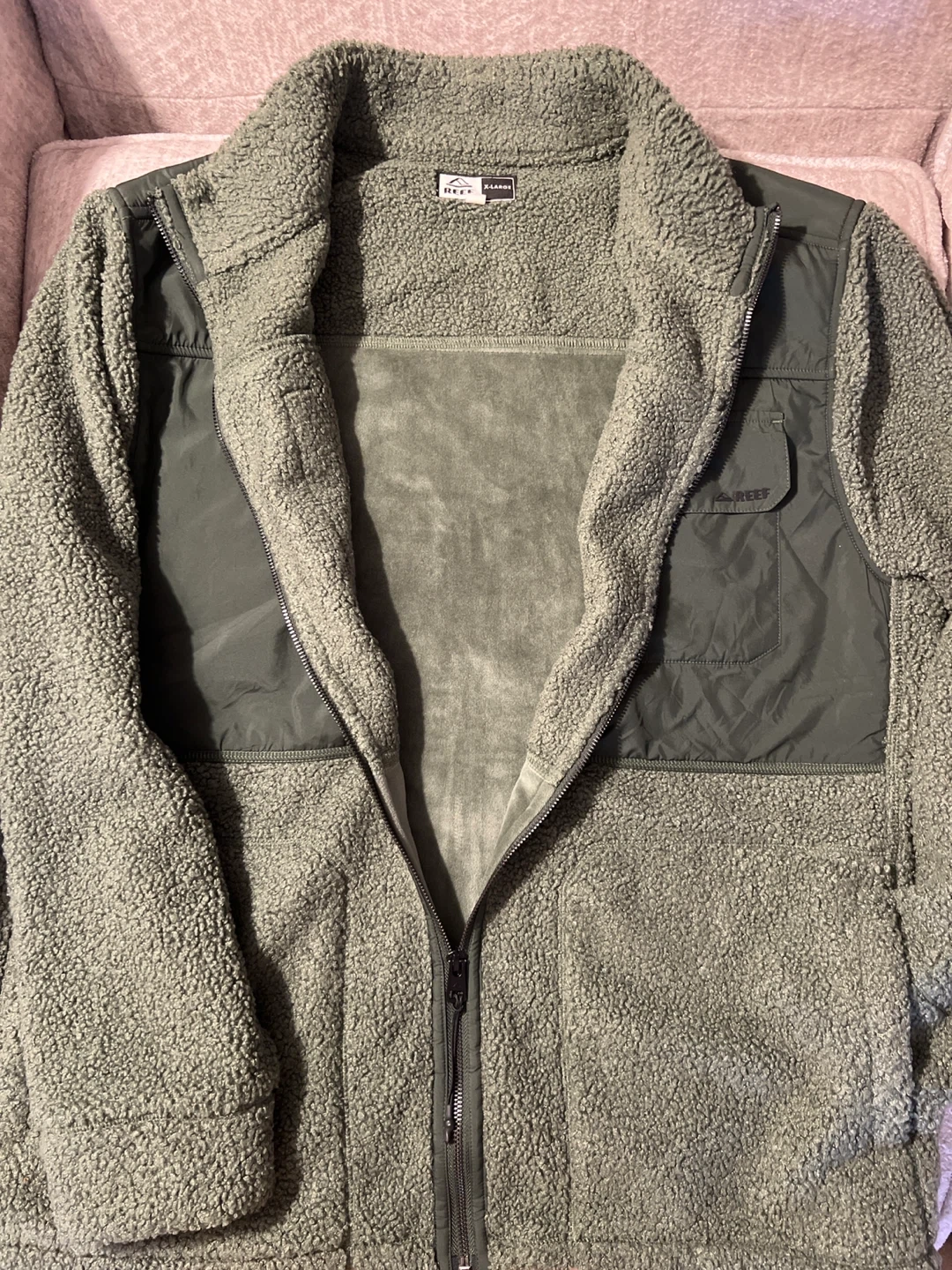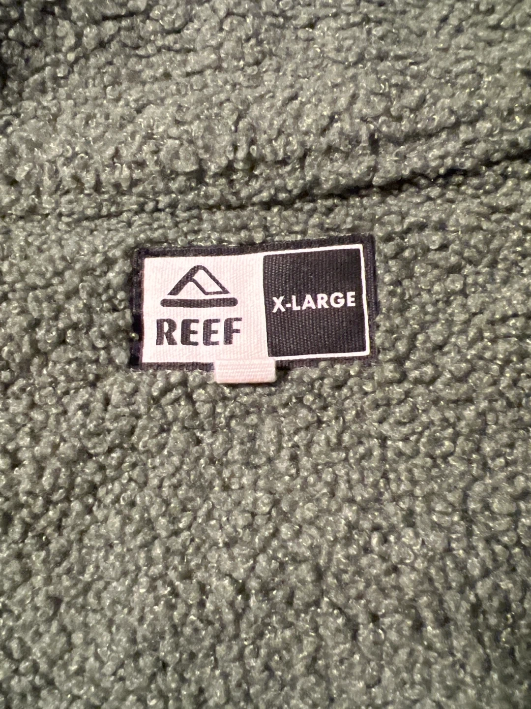 This is a Reef fleece jacket in olive green. It's a size X-Large and in great condition. Perfect for staying warm and stylish! Cozy!