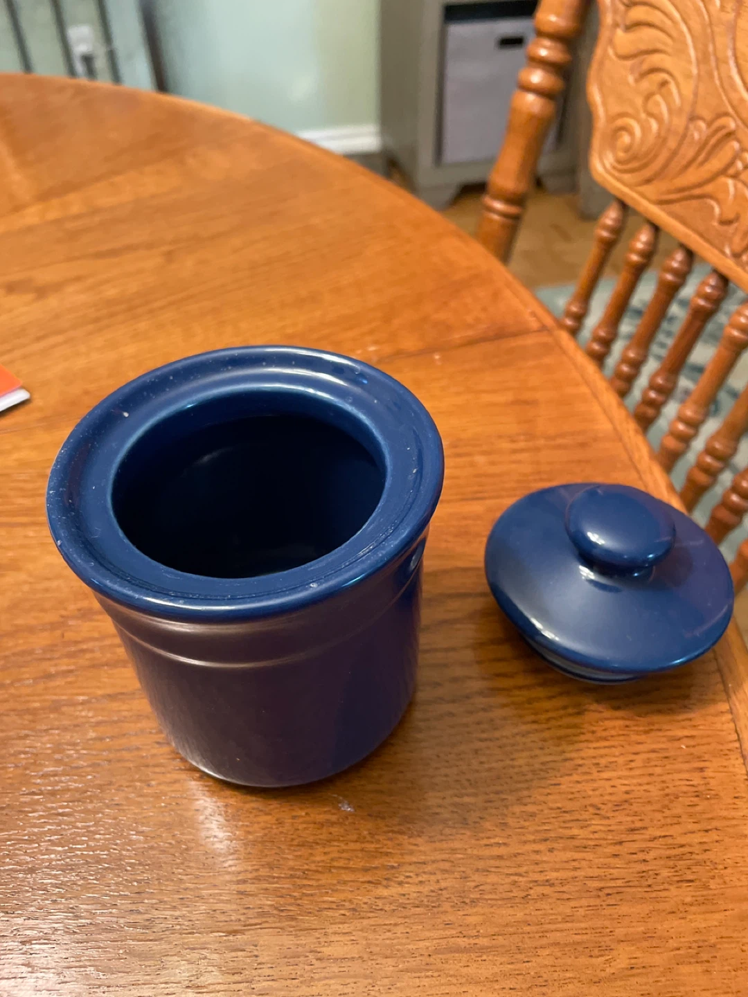 Selling a lovely blue stoneware jar with a matching lid. The jar has a classic look and would fit well in any kitchen or living space