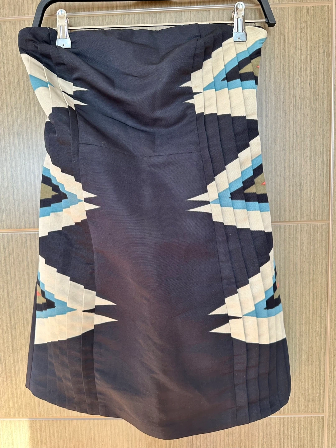 This is an Urban Outfitters strapless mini dress in dark navy with a unique geometric pattern. It's perfect for a night out or a special occasion. The dress is in great condition and ready for a new owner!