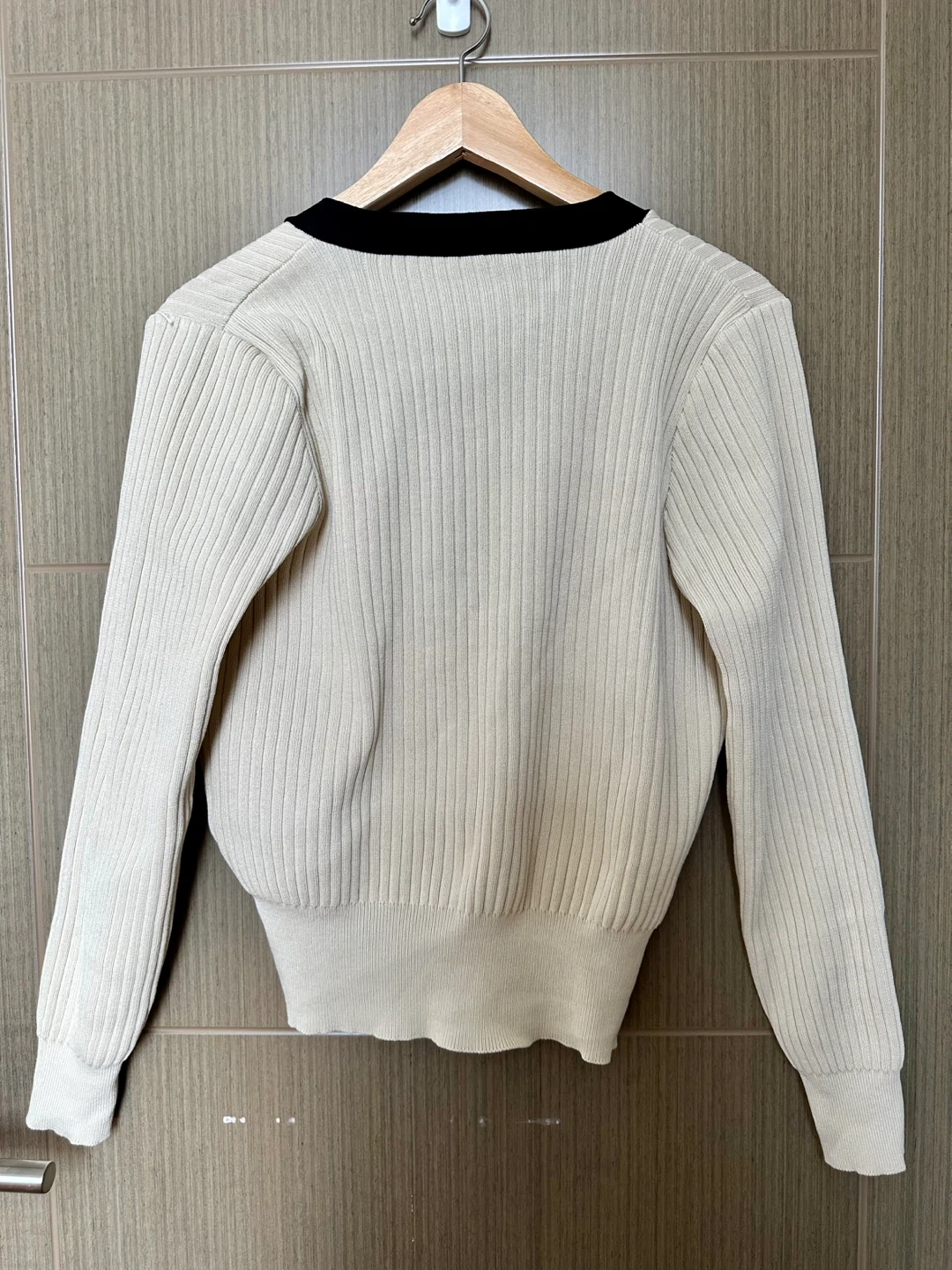 Selling a cream-colored cardigan with black trim! It's a stylish piece that's perfect for layering. The cardigan features a ribbed texture and gold buttons, adding a touch of elegance to any outfit. It's in great condition and ready for a new home